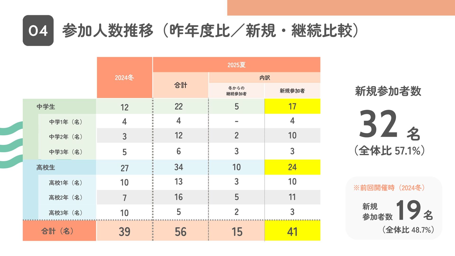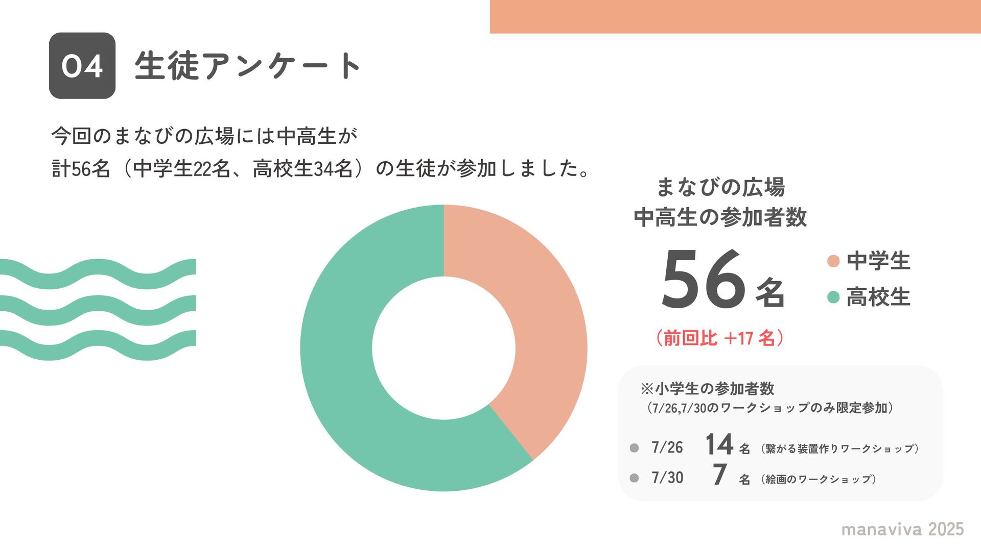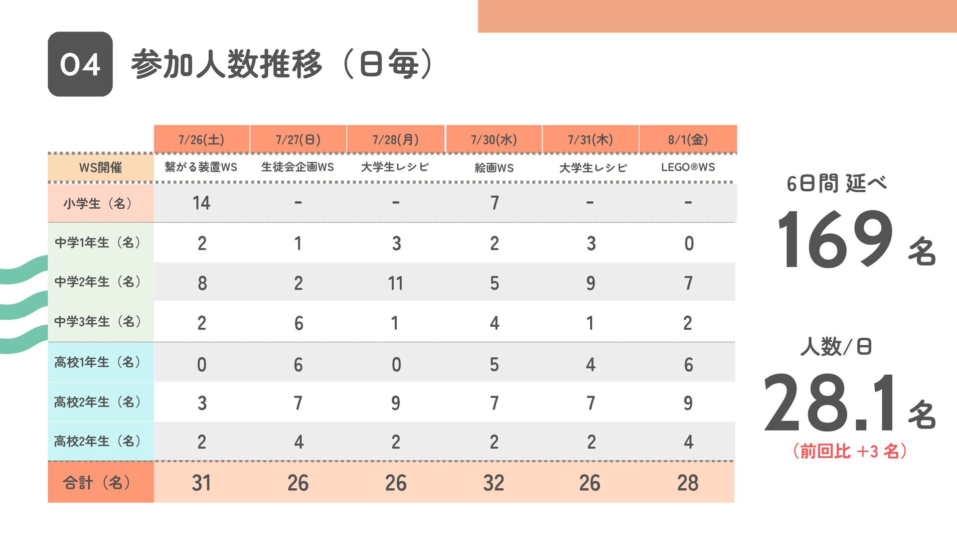7/26(土) 7/30(水) WS開催 7/27(日) 7/31(木) 7/28(月) 8/1(金) 繋がる装置WS 絵画WS 生徒会企画WS 大学生レシピ 大学生レシピ LEGO®︎WS 高校2年生(名) 高校2年生(名) 中学3年生(名) 中学2年生(名) 中学1年生(名) 小学生(名) 高校1年生(名) 14 7 - - - - 2 2 1 3 3 0 8 5 2 9 11 7 2 4 6 1 1 2 0 5 6 4 0 6 3 31 7 32 7 26 7 26 9 26 9 28 2 2 4 2 2 4 (前回比 +3 名)