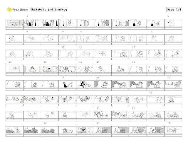 A storyboard assignment where students were tasked with re-imagining the fable, The Rabbit and The Frog, in storyboard format.