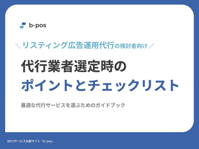 代⾏業者選定時の ポイントとチェックリスト \ リスティング広告運⽤代⾏の検討者向け ∕ 最適な代⾏サービスを選ぶためのガイドブック BPOサービス⽐較サイト「b-pos」
