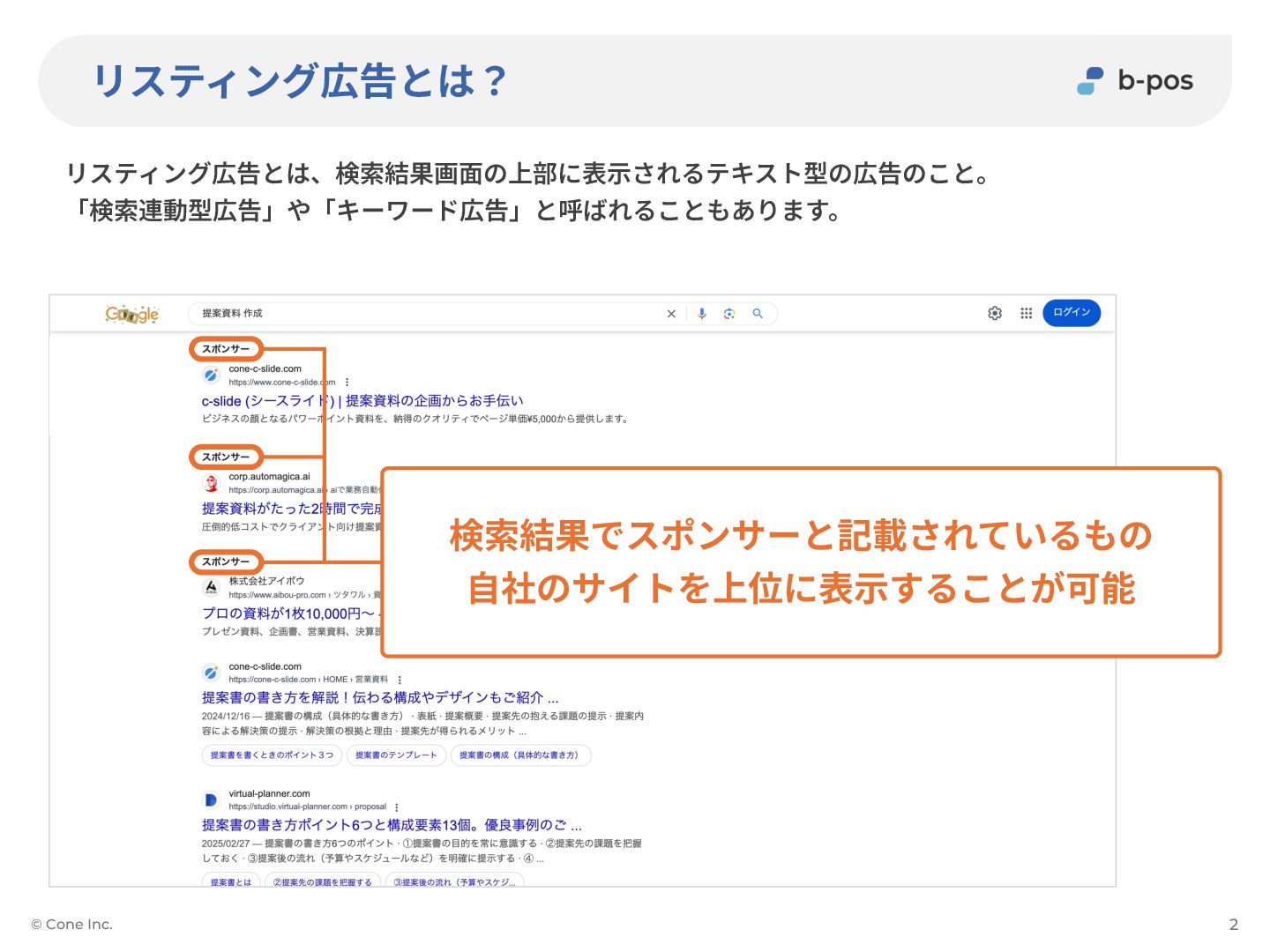 リスティング広告とは? © Cone Inc. リスティング広告とは、検索結果画⾯の上部に表⽰されるテキスト型の広告のこと。 「検索連動型広告」や「キーワード広告」と呼ばれることもあります。 2 検索結果でスポンサーと記載されているもの ⾃社のサイトを上位に表⽰することが可能