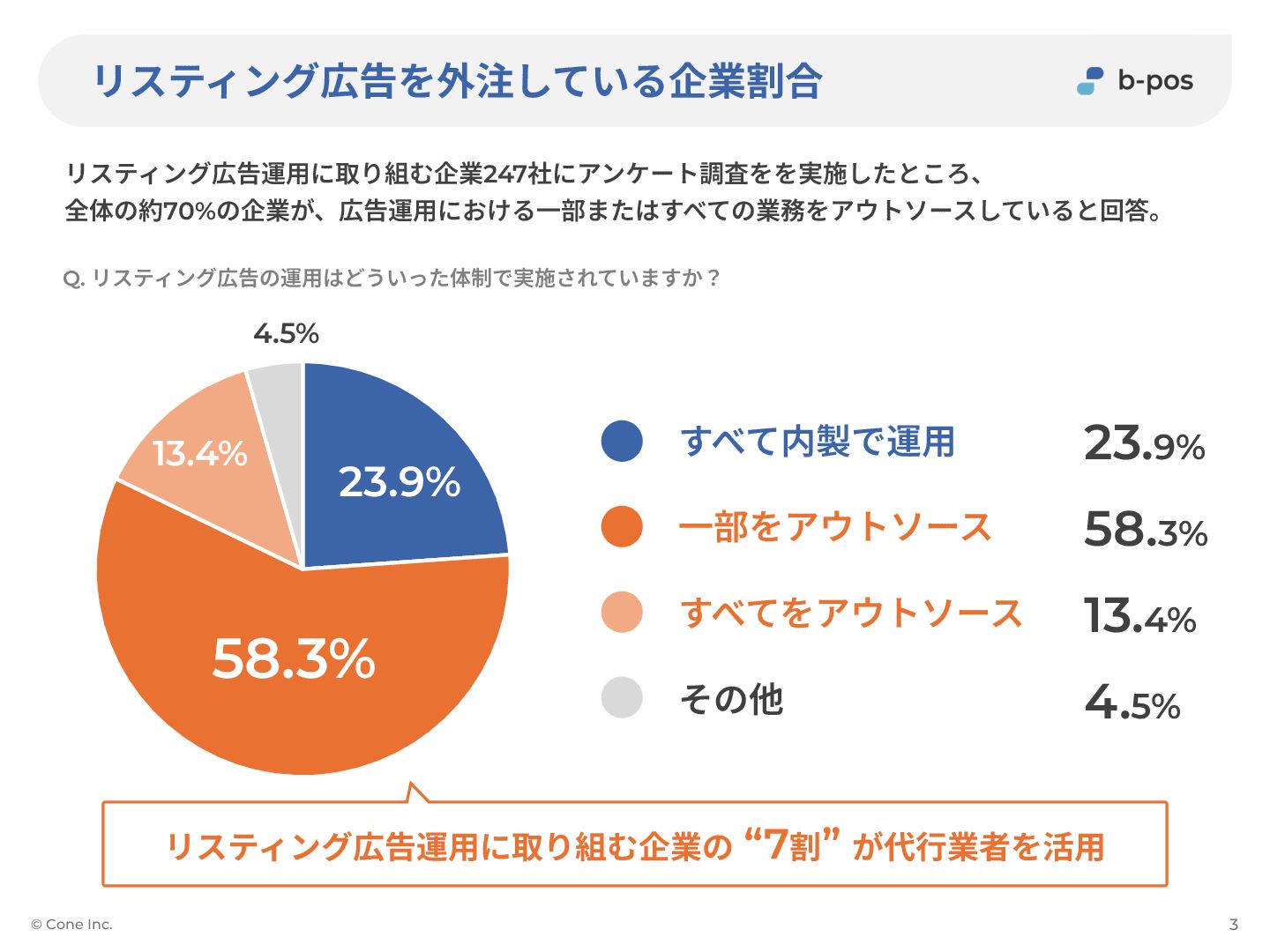 リスティング広告を外注している企業割合 リスティング広告運⽤に取り組む企業247社にアンケート調査をを実施したところ、 全体の約70%の企業が、広告運⽤における⼀部またはすべての業務をアウトソースしていると回答。 © Cone Inc. 3 Q. リスティング広告の運⽤はどういった体制で実施されていますか? 23.9%
