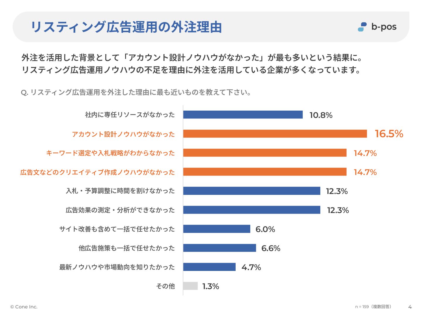82.4% その他 リスティング以外の広告施策 サイト改善のアドバイス 効果分析のレポーティング 広告効果の測定‧改善提案 予算調整などの配信管理 広告⽂の作成‧改善 キーワードの選定‧調整 ⼊札戦略などの戦略⽴案 媒体選定のアドバイス アカウントの初期設定 満⾜度の⾼い外注業務 「アカウントの初期設定」「広告⽂作成」「サイト改善アドバイス」の満⾜度が⾼くなってることから CTRやCVRの改善に近い業務を依頼することで、成果に繋がりやすくなることがわかります。 © Cone Inc. 7 n = 159(複数回答) 全51件 全69件 全61件 全65件 全45件 全44件 全42件 全30件 全26件 全16件 全6件 外注業務ごとの、成果に「⾮常に満⾜」「やや満⾜」と回答した割合 アカウントの初期設定 広告⽂の作成‧改善 サイト改善のアドバイス