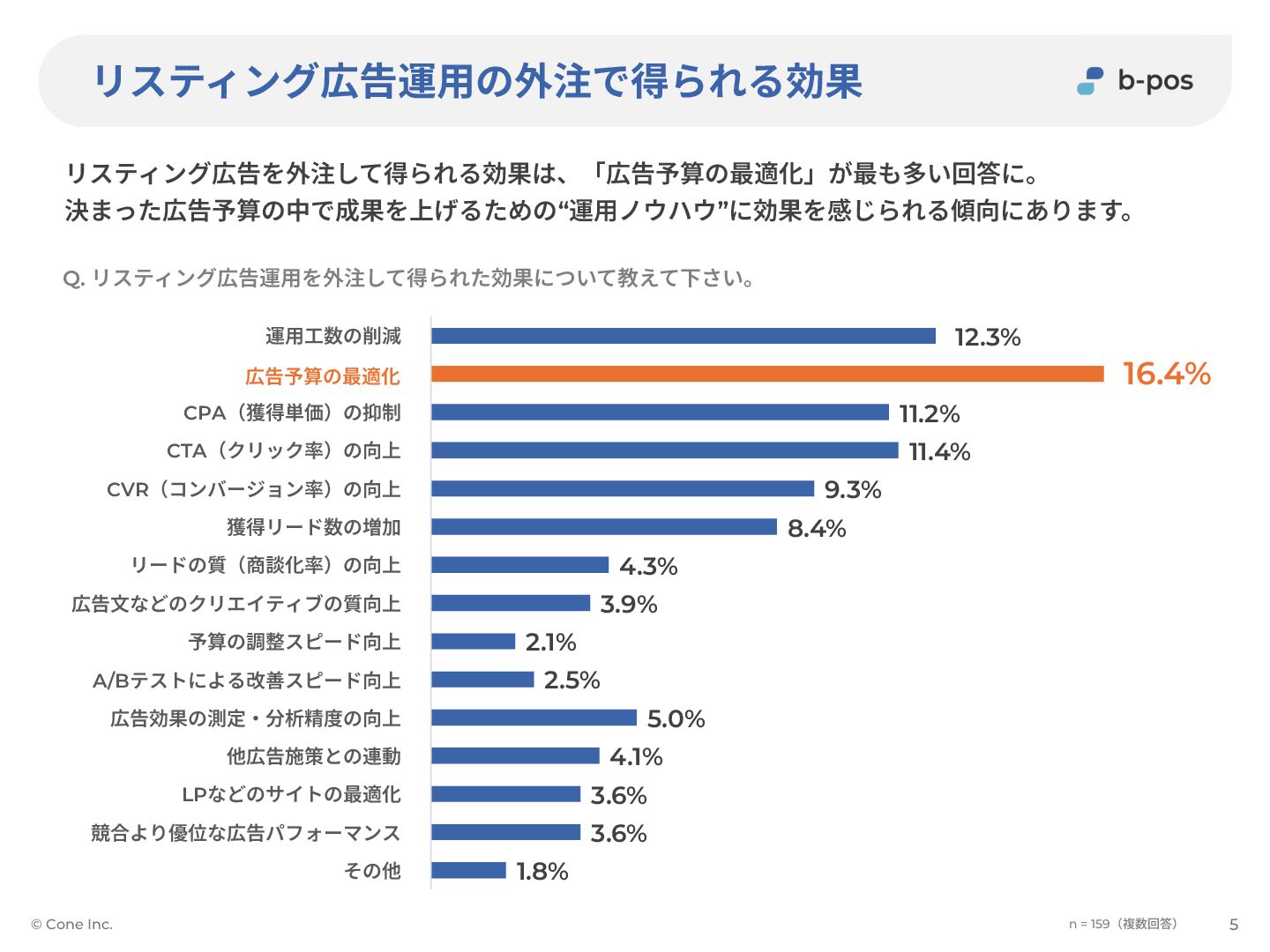 その他 最新ノウハウや市場動向を知りたかった 他広告施策も⼀括で任せたかった サイト改善も含めて⼀括で任せたかった 広告効果の測定‧分析ができなかった ⼊札‧予算調整に時間を割けなかった 広告⽂などのクリエイティブ作成ノウハウがなかった キーワード選定や⼊札戦略がわからなかった アカウント設計ノウハウがなかった 社内に専任リソースがなかった リスティング広告運⽤の外注理由 外注を活⽤した背景として「アカウント設計ノウハウがなかった」が最も多いという結果に。 リスティング広告運⽤ノウハウの不⾜を理由に外注を活⽤している企業が多くなっています。 © Cone Inc. 4 n = 159(複数回答) Q. リスティング広告運⽤を外注した理由に最も近いものを教えて下さい。 アカウント設計ノウハウがなかった キーワード選定や⼊札戦略がわからなかった 広告⽂などのクリエイティブ作成ノウハウがなかった