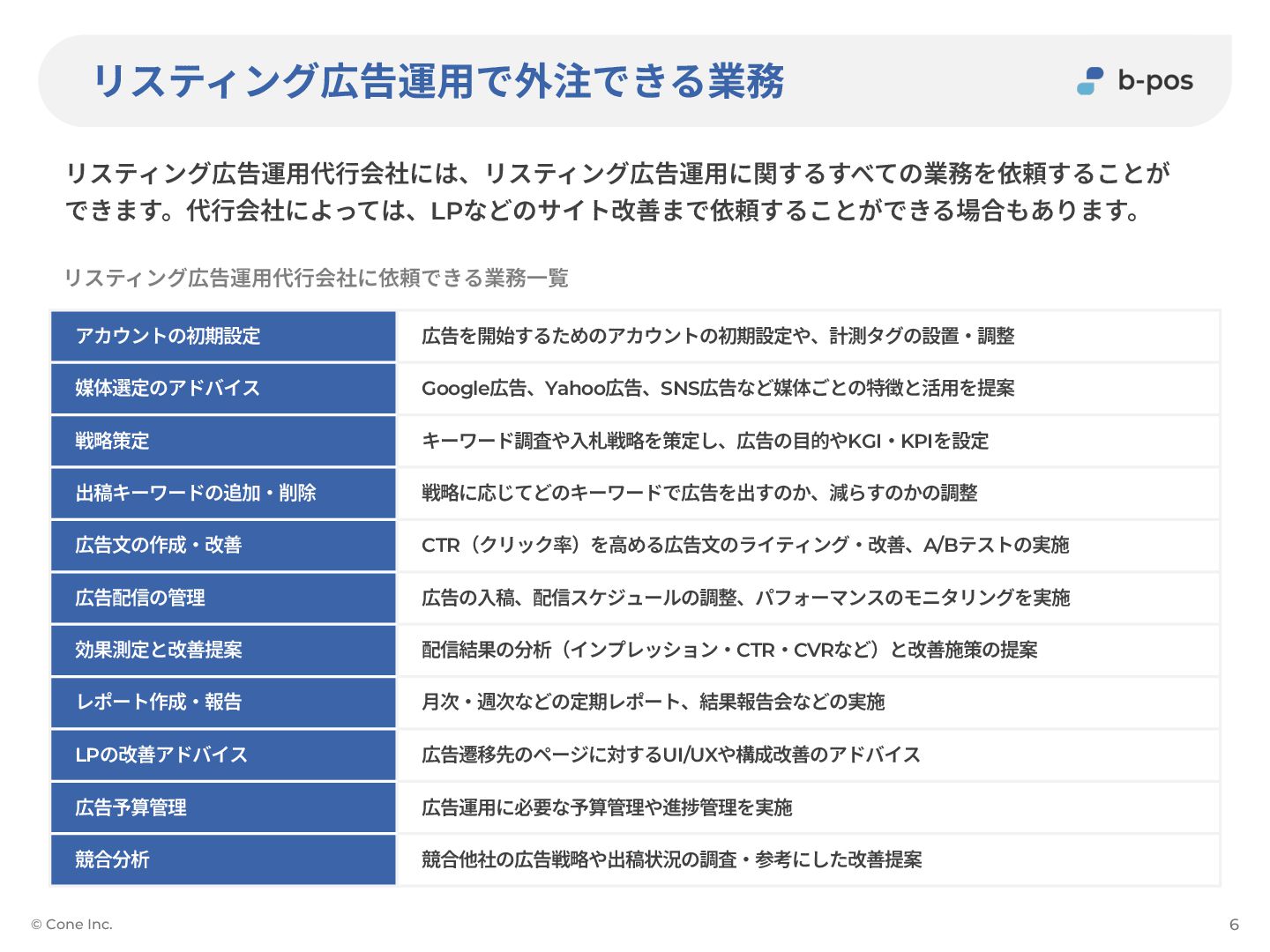 リスティング広告運⽤で外注できる業務 リスティング広告運⽤代⾏会社には、リスティング広告運⽤に関するすべての業務を依頼することが できます。代⾏会社によっては、LPなどのサイト改善まで依頼することができる場合もあります。 © Cone Inc. 6 アカウントの初期設定 広告を開始するためのアカウントの初期設定や、計測タグの設置‧調整 媒体選定のアドバイス
