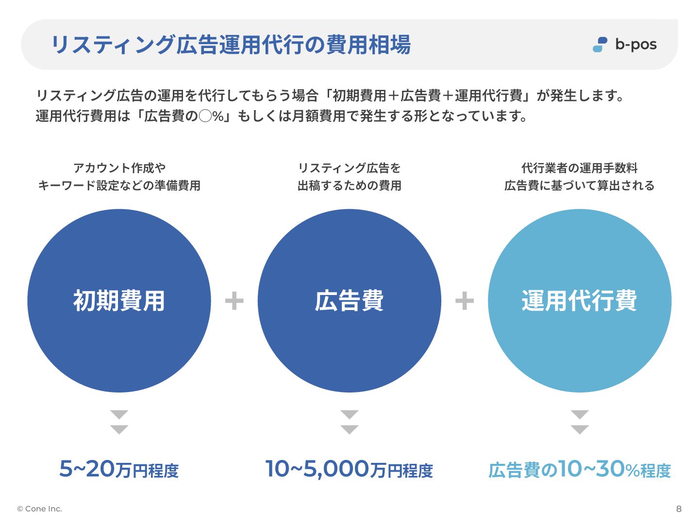 リスティング広告運⽤代⾏の費⽤相場 リスティング広告の運⽤を代⾏してもらう場合「初期費⽤+広告費+運⽤代⾏費」が発⽣します。 運⽤代⾏費⽤は「広告費の◯%」もしくは⽉額費⽤で発⽣する形となっています。 © Cone Inc. 8 初期費⽤ 広告費 運⽤代⾏費