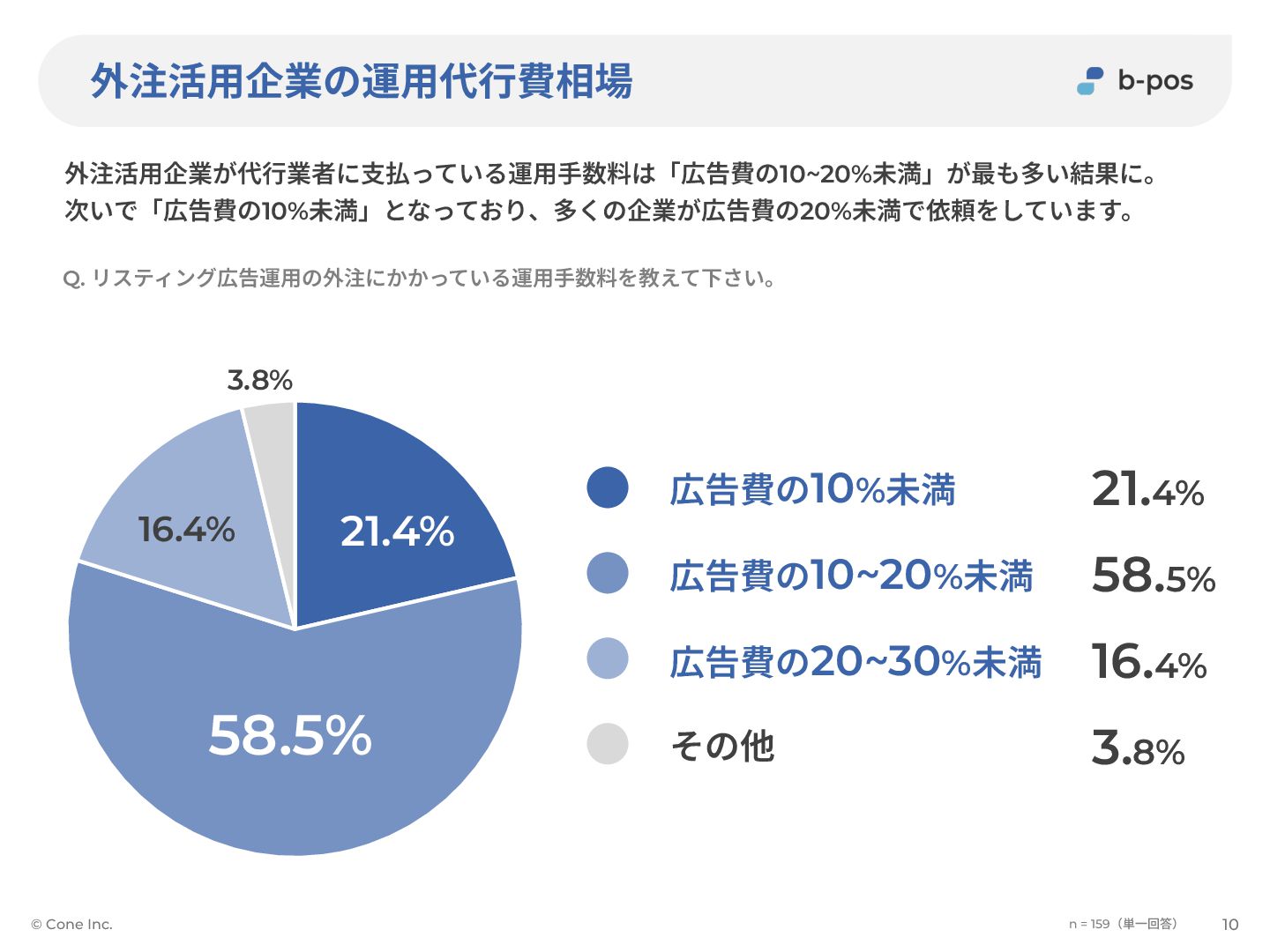 500万~1,000万円未満 100万~500万円未満 50万~100万円未満 30万~50万円未満 10万~30万円未満 10万円未満 外注活⽤企業の広告費相場 外注活⽤企業がリスティング広告に出稿している⾦額は「⽉間50万~100万円」が最も多い結果に。 多くの企業が複雑なスキルが必要になってくる出稿⾦額帯で外注を活⽤していることがわかります。 © Cone Inc. 9 n = 159(単⼀回答) Q. リスティング広告の運⽤に⽉間どのくらいの費⽤を出稿していますか? 50万~100万円未満 複雑な運⽤スキルが必要になる 「50~100万円」で多くの企業が外注を活⽤
