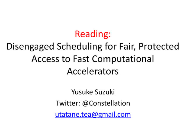 System Reading meetup 2 http://system-reading.connpass.com/event/8493/ Reading ASPLOS '14, "Disengaged Scheduling for Fair, Protected Access to Fast Computational Accelerators". http://www.cs.rochester.edu/~kmenycht/