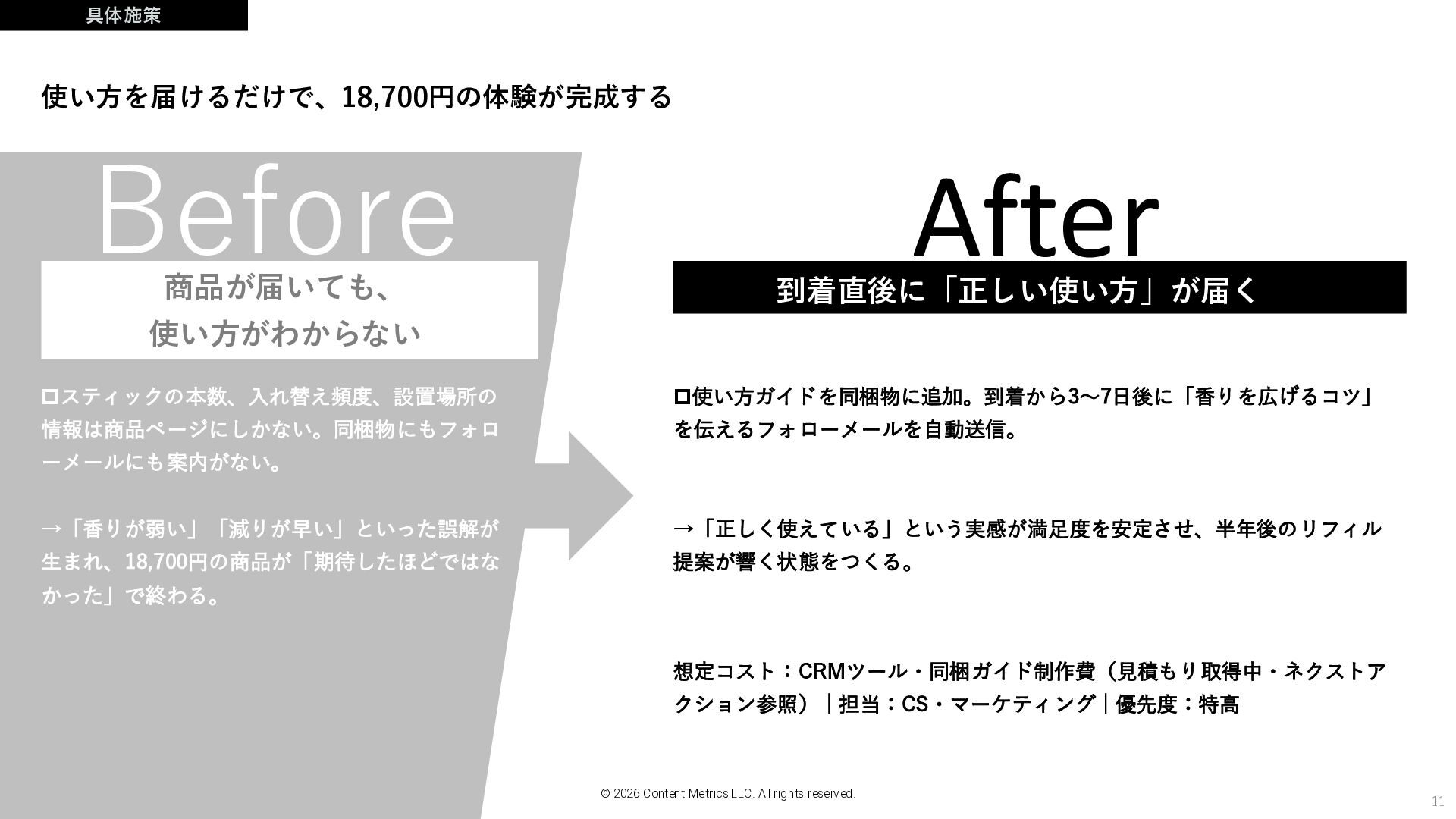 © 2026 Content Metrics LLC. All rights reserved. 到着直後に「正しい使い方」が届く 使い方ガイドを同梱物に追加。到着から3〜7日後に「香りを広げるコツ」 を伝えるフォローメールを自動送信。 →「正しく使えている」という実感が満足度を安定させ、半年後のリフィル 提案が響く状態をつくる。 商品が届いても、 使い方がわからない 使い方を届けるだけで、18,700円の体験が完成する 想定コスト:CRMツール・同梱ガイド制作費(見積もり取得中・ネクストア クション参照) | 担当:CS・マーケティング | 優先度:特高