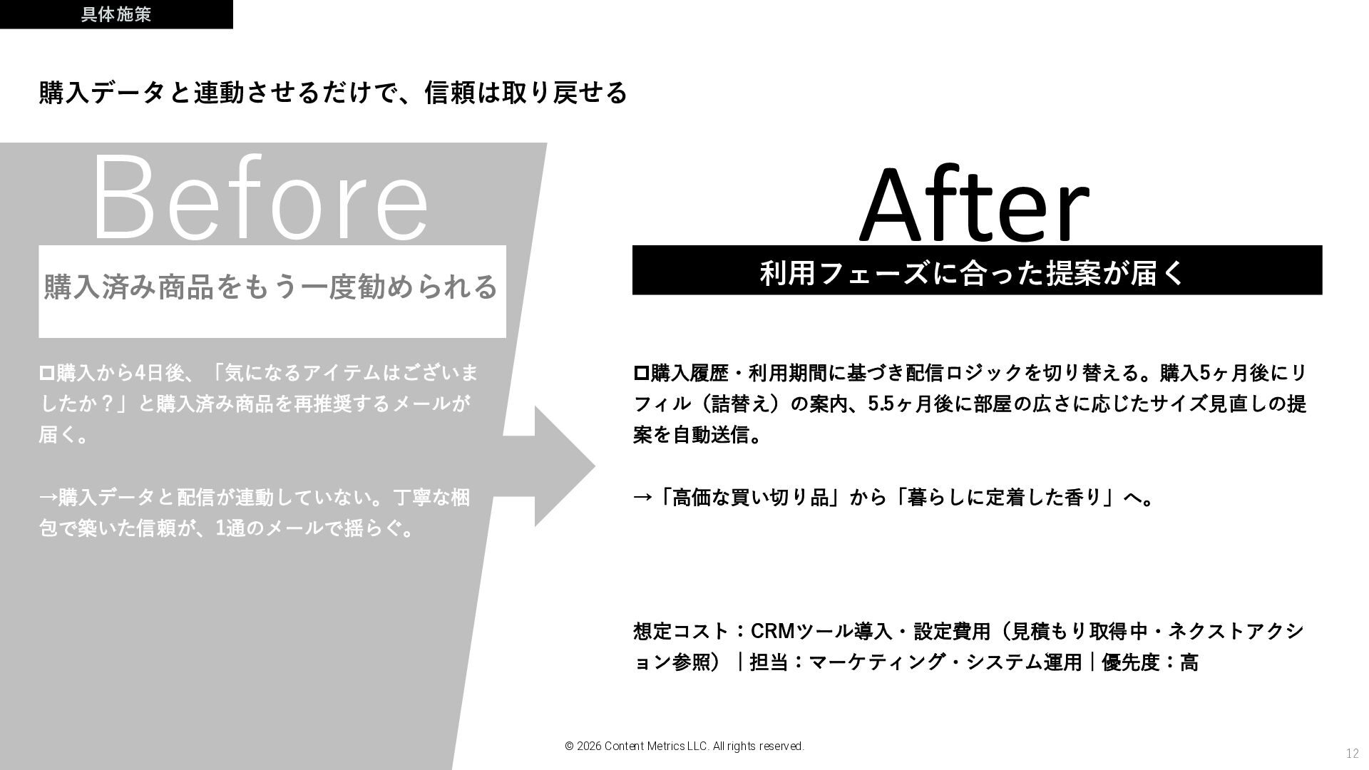 2026 Content Metrics LLC. All rights reserved. 利用フェーズに合った提案が届く 購入履歴・利用期間に基づき配信ロジックを切り替える。購入5ヶ月後にリ フィル(詰替え)の案内、5.5ヶ月後に部屋の広さに応じたサイズ見直しの提 案を自動送信。 →「高価な買い切り品」から「暮らしに定着した香り」へ。 購入済み商品をもう一度勧められる 購入データと連動させるだけで、信頼は取り戻せる 想定コスト:CRMツール導入・設定費用(見積もり取得中・ネクストアクシ ョン参照) | 担当:マーケティング・システム運用 | 優先度:高