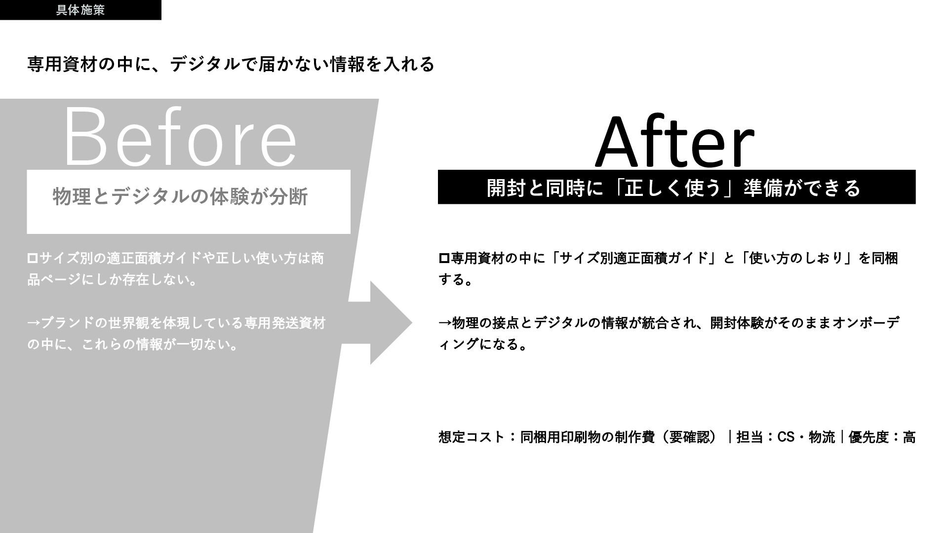 Before After サイズ別の適正面積ガイドや正しい使い方は商 品ページにしか存在しない。 →ブランドの世界観を体現している専用発送資材 の中に、これらの情報が一切ない。 具体施策 開封と同時に「正しく使う」準備ができる 専用資材の中に「サイズ別適正面積ガイド」と「使い方のしおり」を同梱 する。