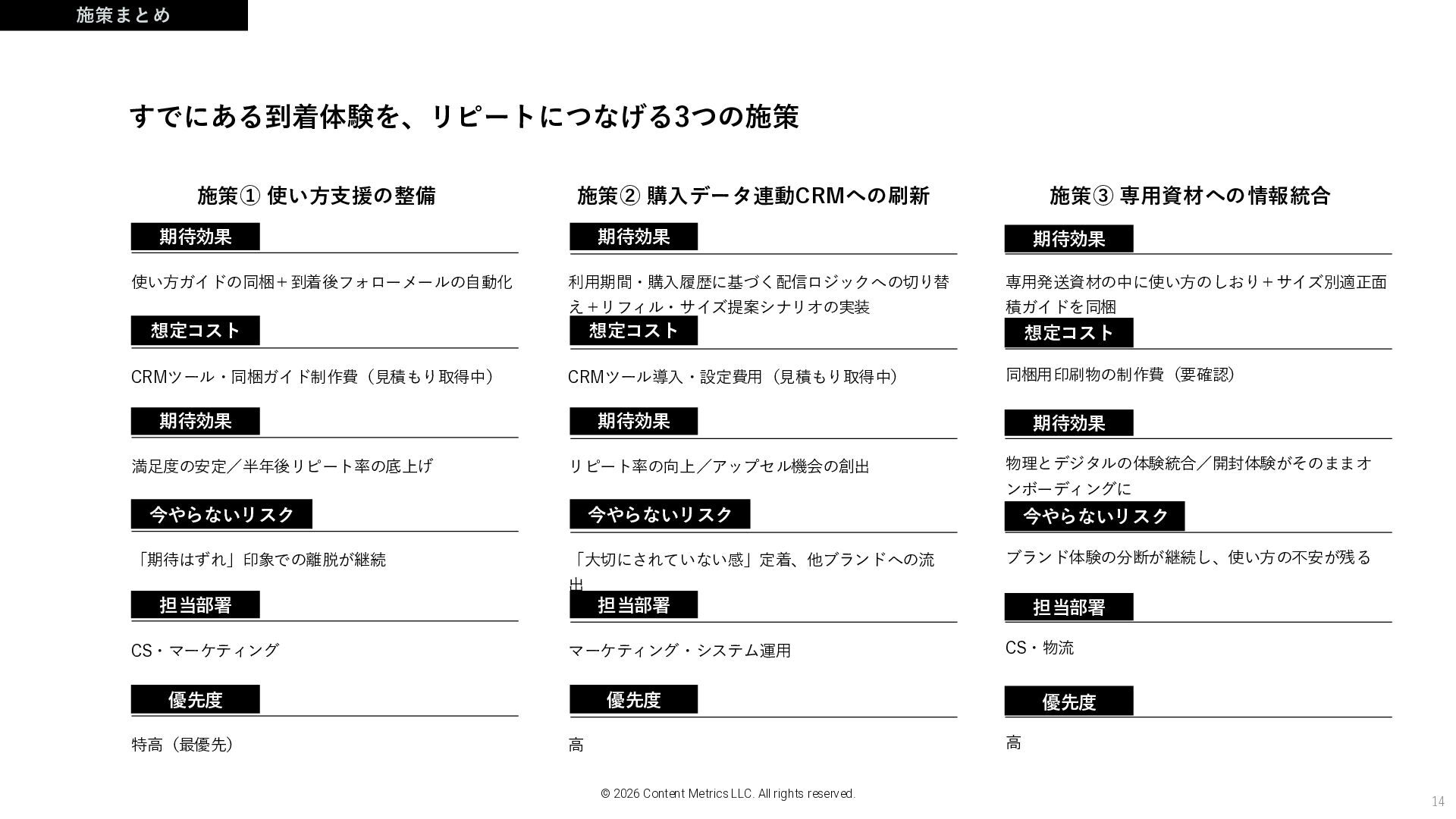 期待効果 想定コスト 期待効果 今やらないリスク 担当部署 優先度 期待効果 想定コスト 14 施策まとめ © 2026 Content Metrics LLC. All rights reserved. すでにある到着体験を、リピートにつなげる3つの施策 施策① 使い方支援の整備 使い方ガイドの同梱+到着後フォローメールの自動化 CRMツール・同梱ガイド制作費(見積もり取得中) 満足度の安定/半年後リピート率の底上げ 「期待はずれ」印象での離脱が継続 CS・マーケティング 特高(最優先) 施策② 購入データ連動CRMへの刷新 利用期間・購入履歴に基づく配信ロジックへの切り替 え+リフィル・サイズ提案シナリオの実装 CRMツール導入・設定費用(見積もり取得中) リピート率の向上/アップセル機会の創出 「大切にされていない感」定着、他ブランドへの流 出 マーケティング・システム運用 高 施策③ 専用資材への情報統合 専用発送資材の中に使い方のしおり+サイズ別適正面 積ガイドを同梱 同梱用印刷物の制作費(要確認) 物理とデジタルの体験統合/開封体験がそのままオ ンボーディングに ブランド体験の分断が継続し、使い方の不安が残る CS・物流 高