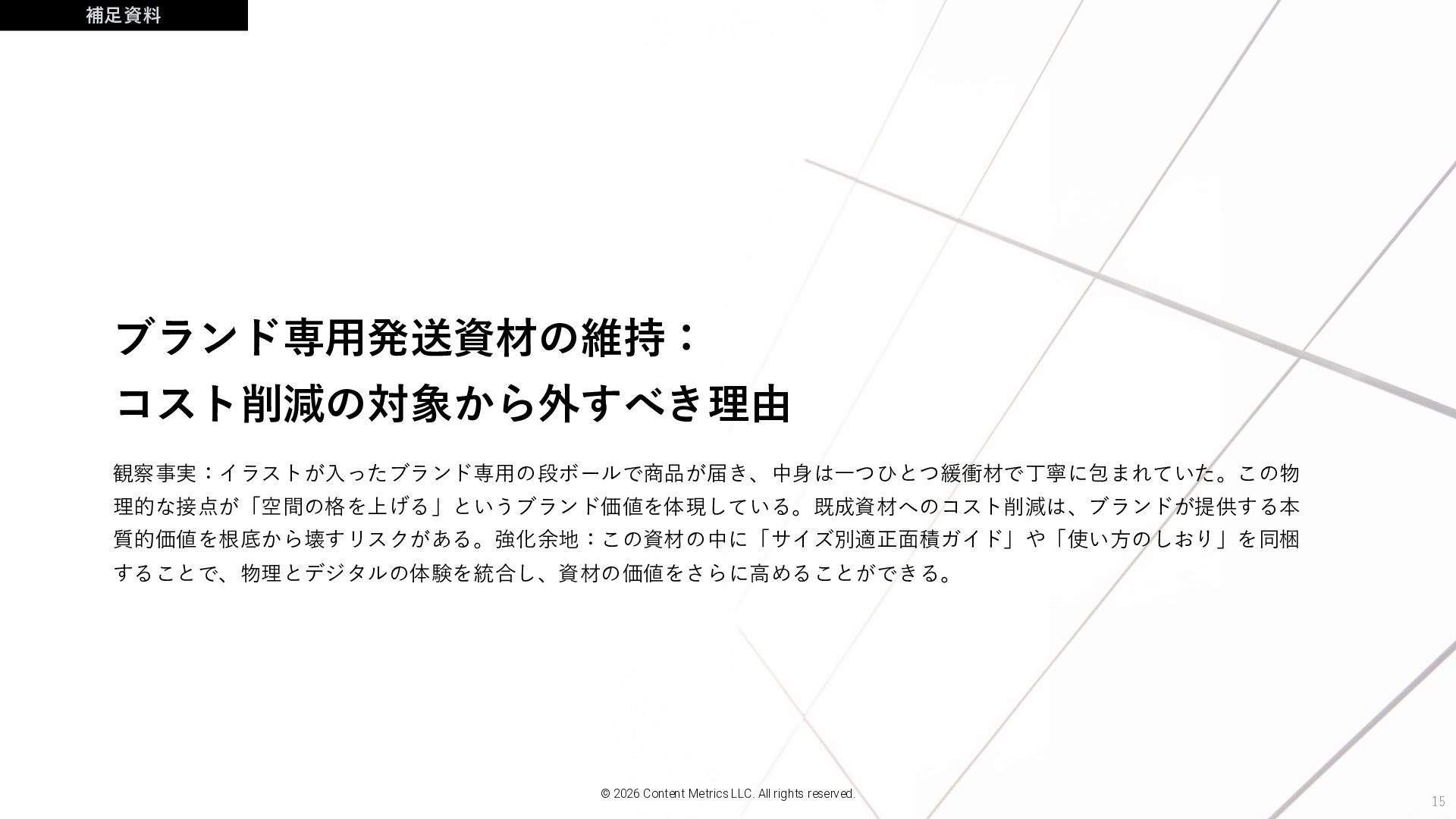 15 ブランド専用発送資材の維持: コスト削減の対象から外すべき理由 観察事実:イラストが入ったブランド専用の段ボールで商品が届き、中身は一つひとつ緩衝材で丁寧に包まれていた。この物 理的な接点が「空間の格を上げる」というブランド価値を体現している。既成資材へのコスト削減は、ブランドが提供する本 質的価値を根底から壊すリスクがある。強化余地:この資材の中に「サイズ別適正面積ガイド」や「使い方のしおり」を同梱 することで、物理とデジタルの体験を統合し、資材の価値をさらに高めることができる。 補足資料 © 2026
