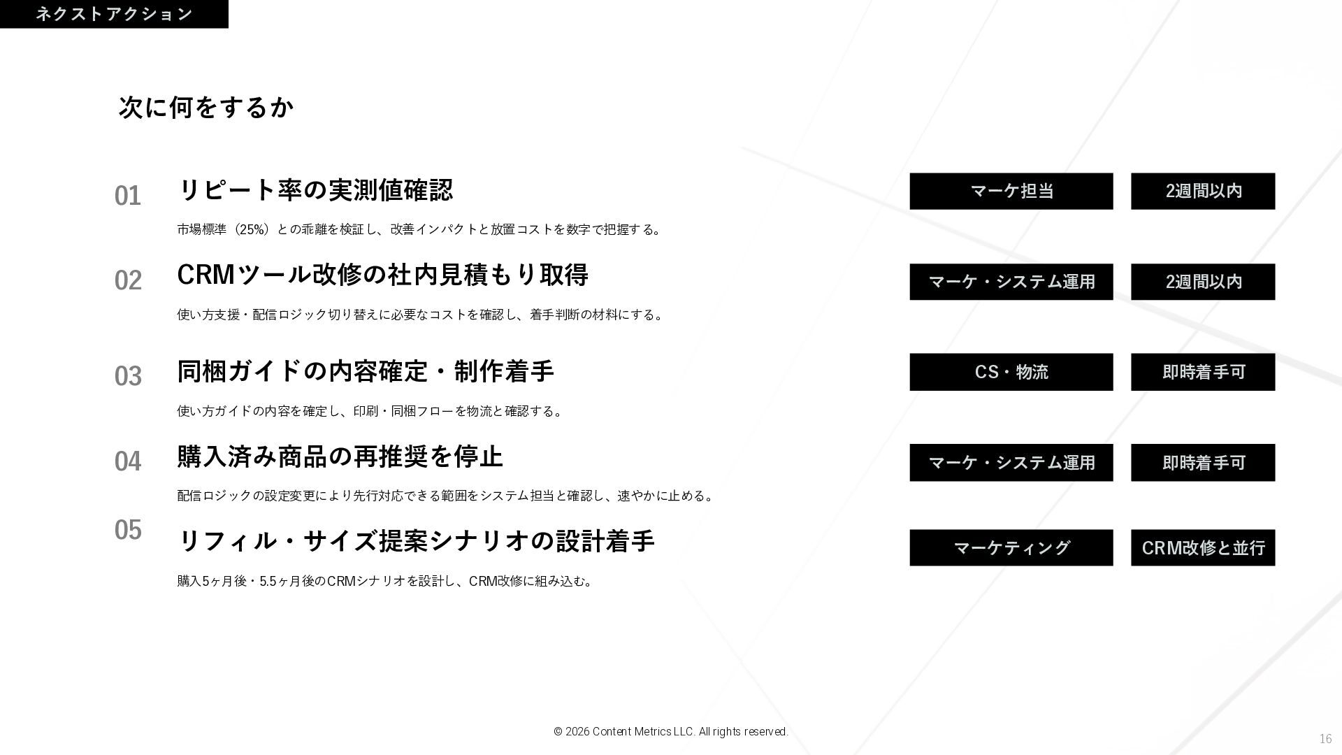 16 リピート率の実測値確認 市場標準(25%)との乖離を検証し、改善インパクトと放置コストを数字で把握する。 CRMツール改修の社内見積もり取得 使い方支援・配信ロジック切り替えに必要なコストを確認し、着手判断の材料にする。 ネクストアクション © 2026 Content Metrics