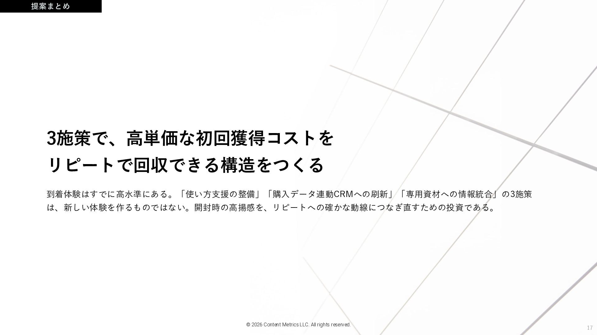 17 3施策で、高単価な初回獲得コストを リピートで回収できる構造をつくる 到着体験はすでに高水準にある。「使い方支援の整備」「購入データ連動CRMへの刷新」「専用資材への情報統合」の3施策 は、新しい体験を作るものではない。開封時の高揚感を、リピートへの確かな動線につなぎ直すための投資である。 提案まとめ © 2026 Content Metrics