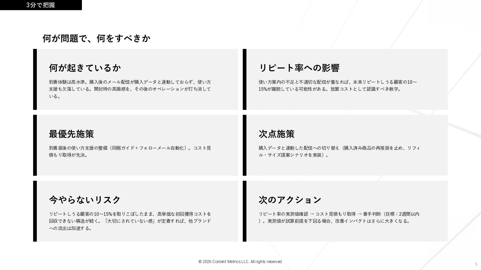 積もり取得が先決。 次点施策 購入データと連動した配信への切り替え(購入済み商品の再推奨を止め、リフィ ル・サイズ提案シナリオを実装)。 今やらないリスク リピートしうる顧客の10〜15%を取りこぼしたまま、高単価な初回獲得コストを 回収できない構造が続く。「大切にされていない感」が定着すれば、他ブランド への流出は加速する。 次のアクション リピート率の実測値確認 → コスト見積もり取得 → 着手判断(目標:2週間以内 )。実測値が試算前提を下回る場合、改善インパクトはさらに大きくなる。 3分で把握 何が問題で、何をすべきか © 2026 Content Metrics LLC. All rights reserved.
