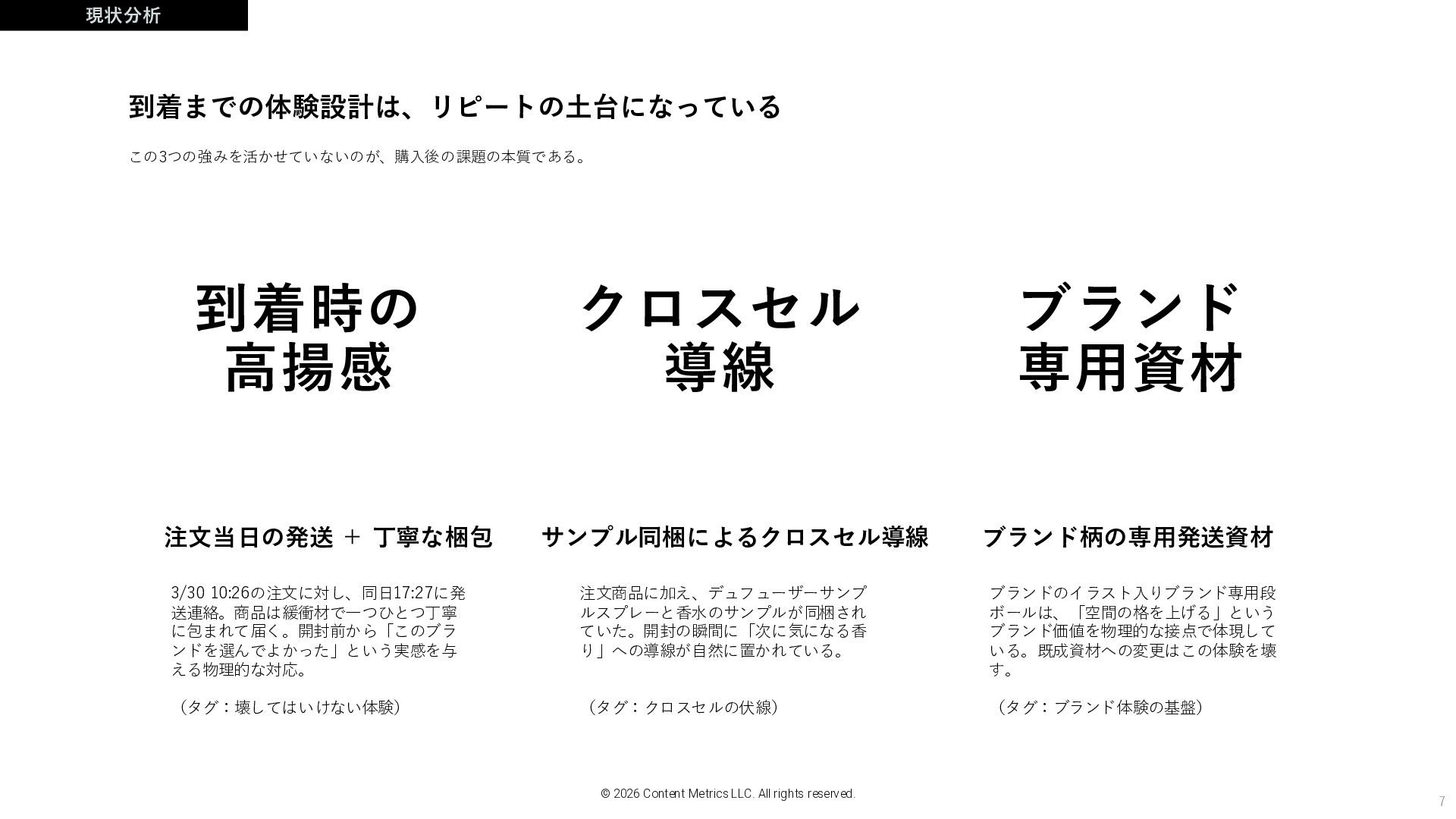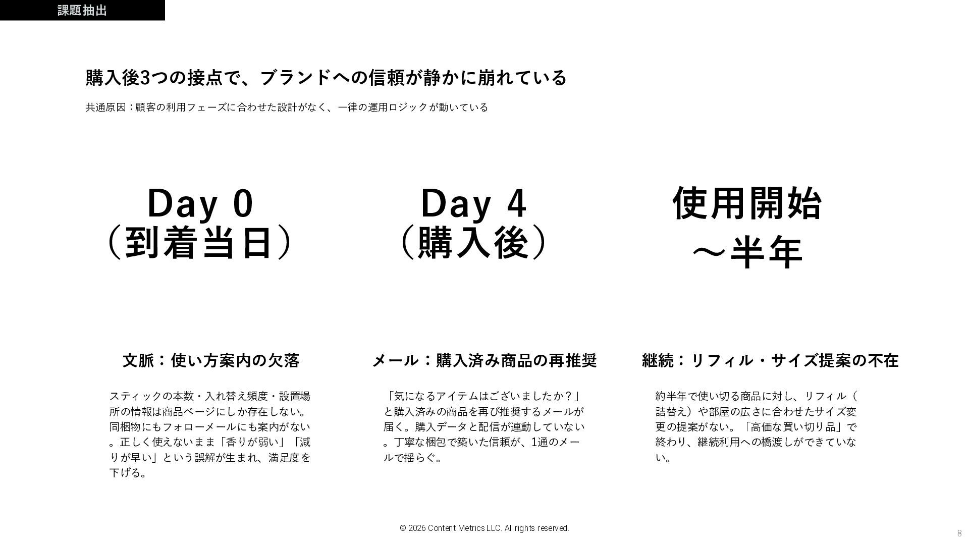 共通原因:顧客の利用フェーズに合わせた設計がなく、一律の運用ロジックが動いている 購入後3つの接点で、ブランドへの信頼が静かに崩れている 課題抽出 「気になるアイテムはございましたか?」 と購入済みの商品を再び推奨するメールが 届く。購入データと配信が連動していない 。丁寧な梱包で築いた信頼が、1通のメー ルで揺らぐ。 約半年で使い切る商品に対し、リフィル( 詰替え)や部屋の広さに合わせたサイズ変 更の提案がない。「高価な買い切り品」で 終わり、継続利用への橋渡しができていな い。 © 2026 Content Metrics LLC. All rights reserved. Day 0 (到着当日) Day 4 (購入後) 使用開始 〜半年