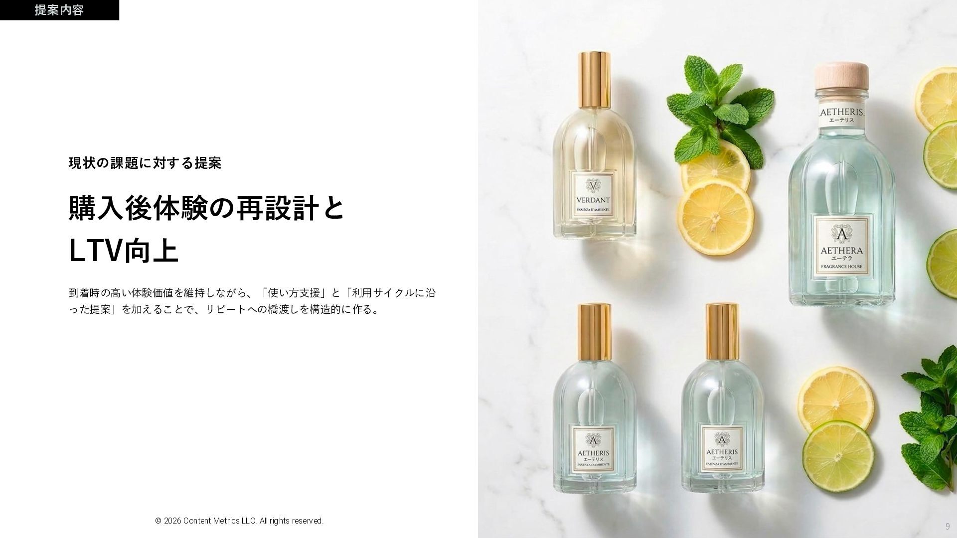 現状の課題に対する提案 9 提案内容 購入後体験の再設計と LTV向上 © 2026 Content Metrics LLC.
