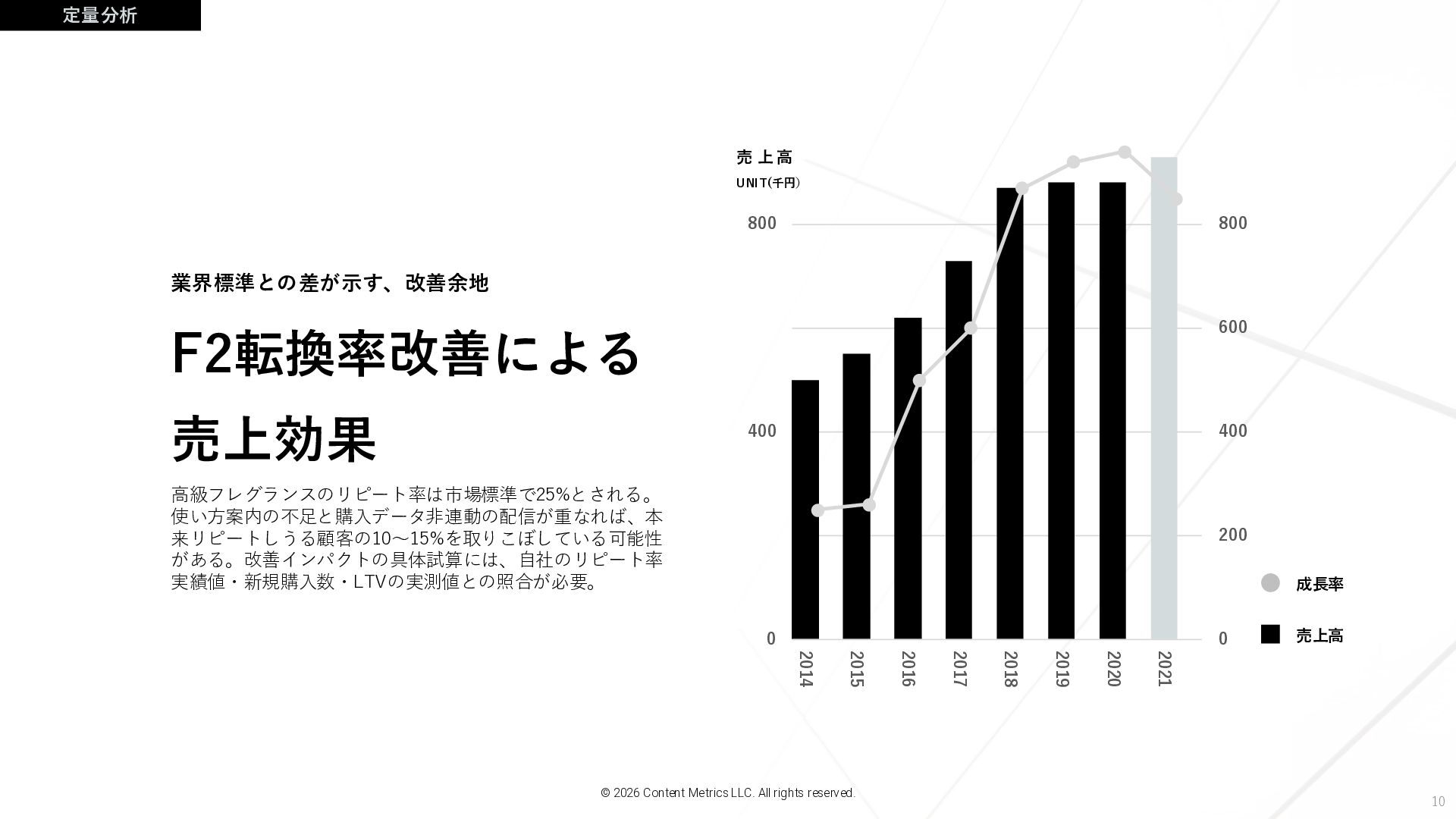 600 800 2014 2015 2016 2017 2018 2019 2020 2021 UNIT(千円) 売 上 高 F2転換率改善による 売上効果 業界標準との差が示す、改善余地 © 2026 Content Metrics LLC. All rights reserved. 高級フレグランスのリピート率は市場標準で25%とされる。 使い方案内の不足と購入データ非連動の配信が重なれば、本 来リピートしうる顧客の10〜15%を取りこぼしている可能性 がある。改善インパクトの具体試算には、自社のリピート率 実績値・新規購入数・LTVの実測値との照合が必要。