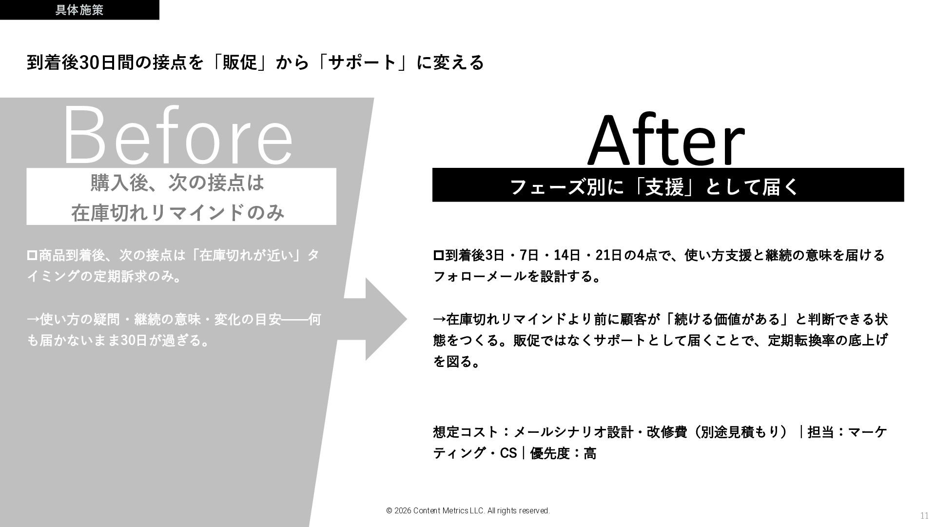 Content Metrics LLC. All rights reserved. フェーズ別に「支援」として届く 到着後3日・7日・14日・21日の4点で、使い方支援と継続の意味を届ける フォローメールを設計する。 →在庫切れリマインドより前に顧客が「続ける価値がある」と判断できる状 態をつくる。販促ではなくサポートとして届くことで、定期転換率の底上げ を図る。 購入後、次の接点は 在庫切れリマインドのみ 到着後30日間の接点を「販促」から「サポート」に変える 想定コスト:メールシナリオ設計・改修費(別途見積もり) | 担当:マーケ ティング・CS | 優先度:高
