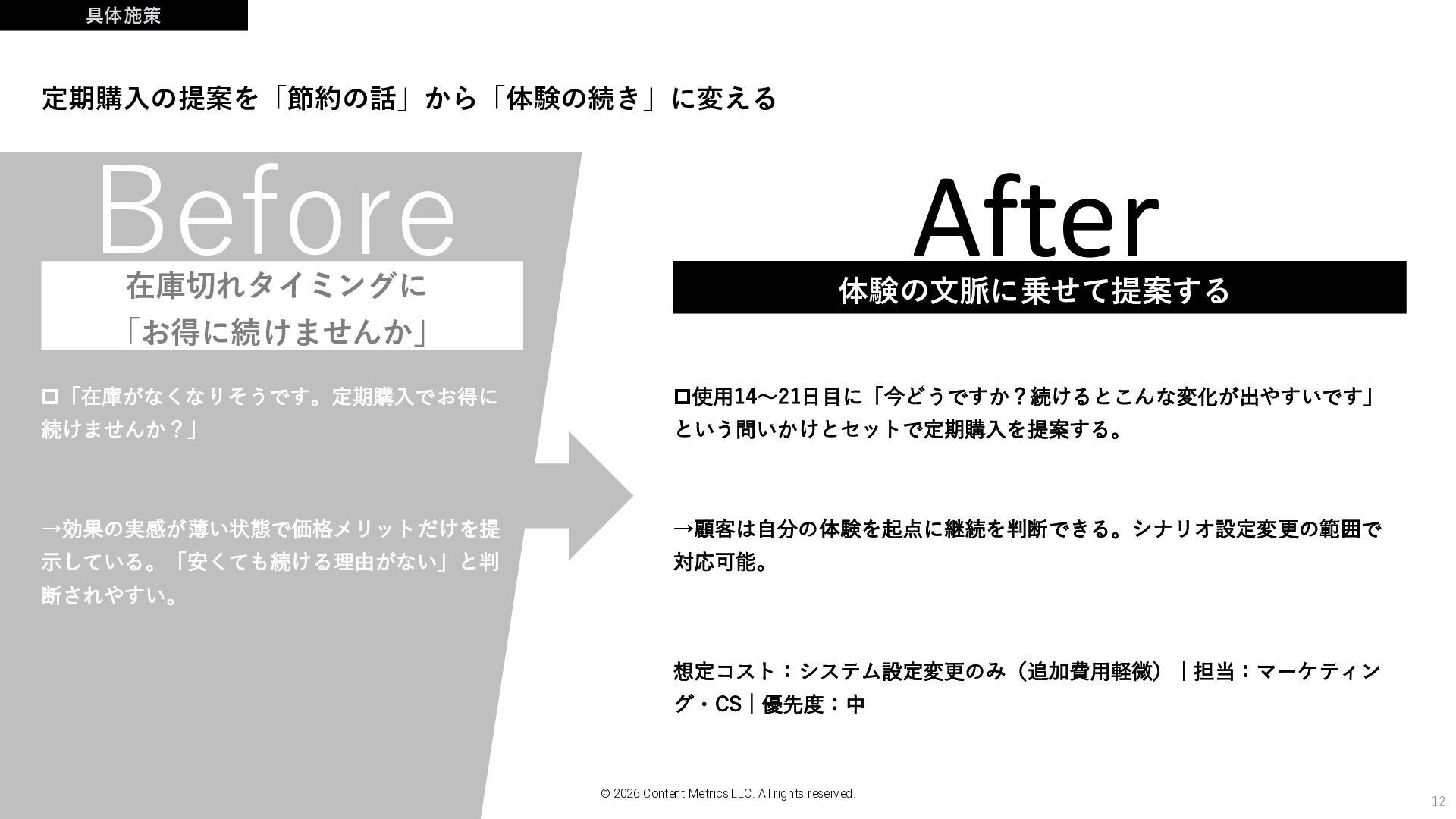 2026 Content Metrics LLC. All rights reserved. 体験の文脈に乗せて提案する 使用14〜21日目に「今どうですか?続けるとこんな変化が出やすいです」 という問いかけとセットで定期購入を提案する。 →顧客は自分の体験を起点に継続を判断できる。シナリオ設定変更の範囲で 対応可能。 在庫切れタイミングに 「お得に続けませんか」 定期購入の提案を「節約の話」から「体験の続き」に変える 想定コスト:システム設定変更のみ(追加費用軽微) | 担当:マーケティン グ・CS | 優先度:中