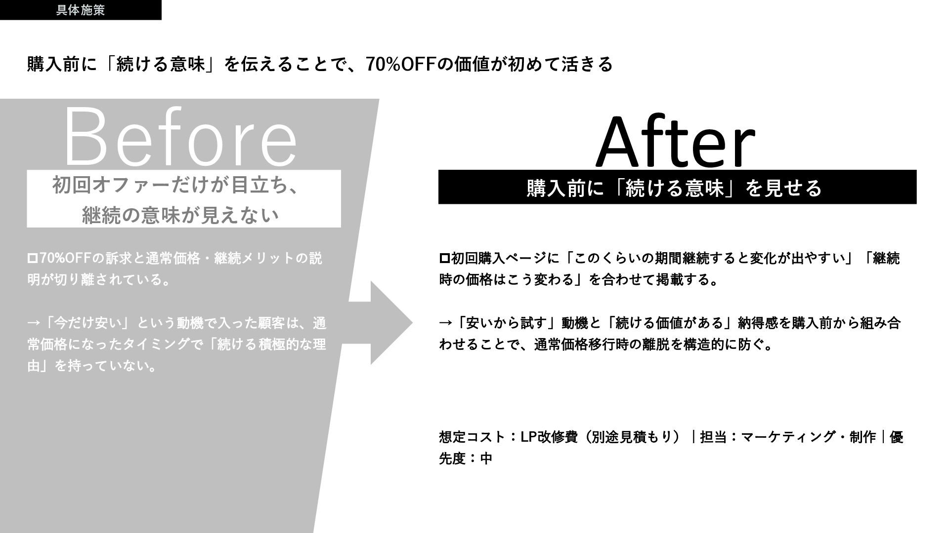 時の価格はこう変わる」を合わせて掲載する。 →「安いから試す」動機と「続ける価値がある」納得感を購入前から組み合 わせることで、通常価格移行時の離脱を構造的に防ぐ。 初回オファーだけが目立ち、 継続の意味が見えない 購入前に「続ける意味」を伝えることで、70%OFFの価値が初めて活きる 想定コスト:LP改修費(別途見積もり) | 担当:マーケティング・制作 | 優 先度:中