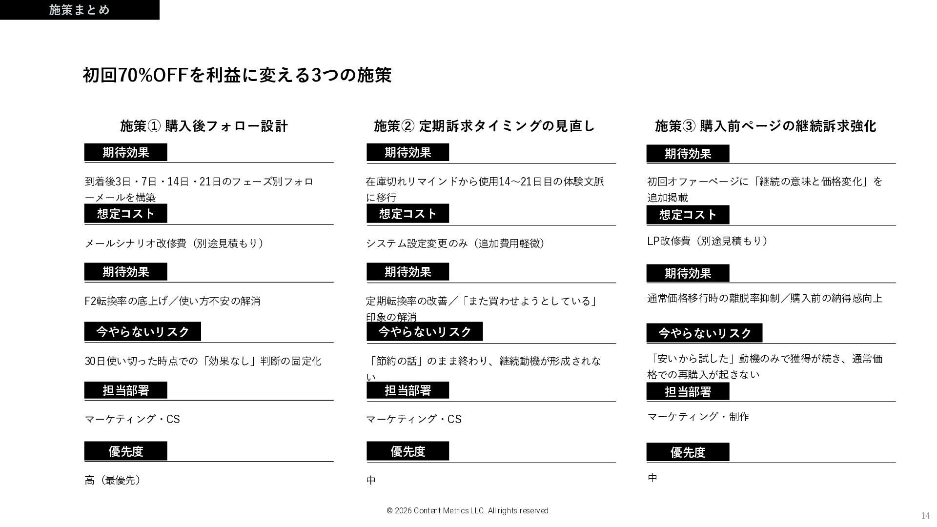 期待効果 想定コスト 期待効果 今やらないリスク 担当部署 優先度 期待効果 想定コスト 14 施策まとめ © 2026 Content Metrics LLC. All rights reserved. 初回70%OFFを利益に変える3つの施策 施策① 購入後フォロー設計 到着後3日・7日・14日・21日のフェーズ別フォロ ーメールを構築 メールシナリオ改修費(別途見積もり) F2転換率の底上げ/使い方不安の解消 30日使い切った時点での「効果なし」判断の固定化 マーケティング・CS 高(最優先) 施策② 定期訴求タイミングの見直し 在庫切れリマインドから使用14〜21日目の体験文脈 に移行 システム設定変更のみ(追加費用軽微) 定期転換率の改善/「また買わせようとしている」 印象の解消 「節約の話」のまま終わり、継続動機が形成されな い マーケティング・CS 中 施策③ 購入前ページの継続訴求強化 初回オファーページに「継続の意味と価格変化」を 追加掲載 LP改修費(別途見積もり) 通常価格移行時の離脱率抑制/購入前の納得感向上 「安いから試した」動機のみで獲得が続き、通常価 格での再購入が起きない マーケティング・制作 中