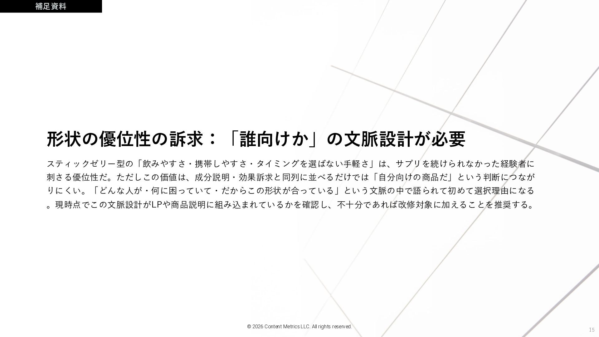 15 形状の優位性の訴求:「誰向けか」の文脈設計が必要 スティックゼリー型の「飲みやすさ・携帯しやすさ・タイミングを選ばない手軽さ」は、サプリを続けられなかった経験者に 刺さる優位性だ。ただしこの価値は、成分説明・効果訴求と同列に並べるだけでは「自分向けの商品だ」という判断につなが りにくい。「どんな人が・何に困っていて・だからこの形状が合っている」という文脈の中で語られて初めて選択理由になる 。現時点でこの文脈設計がLPや商品説明に組み込まれているかを確認し、不十分であれば改修対象に加えることを推奨する。 補足資料 © 2026 Content