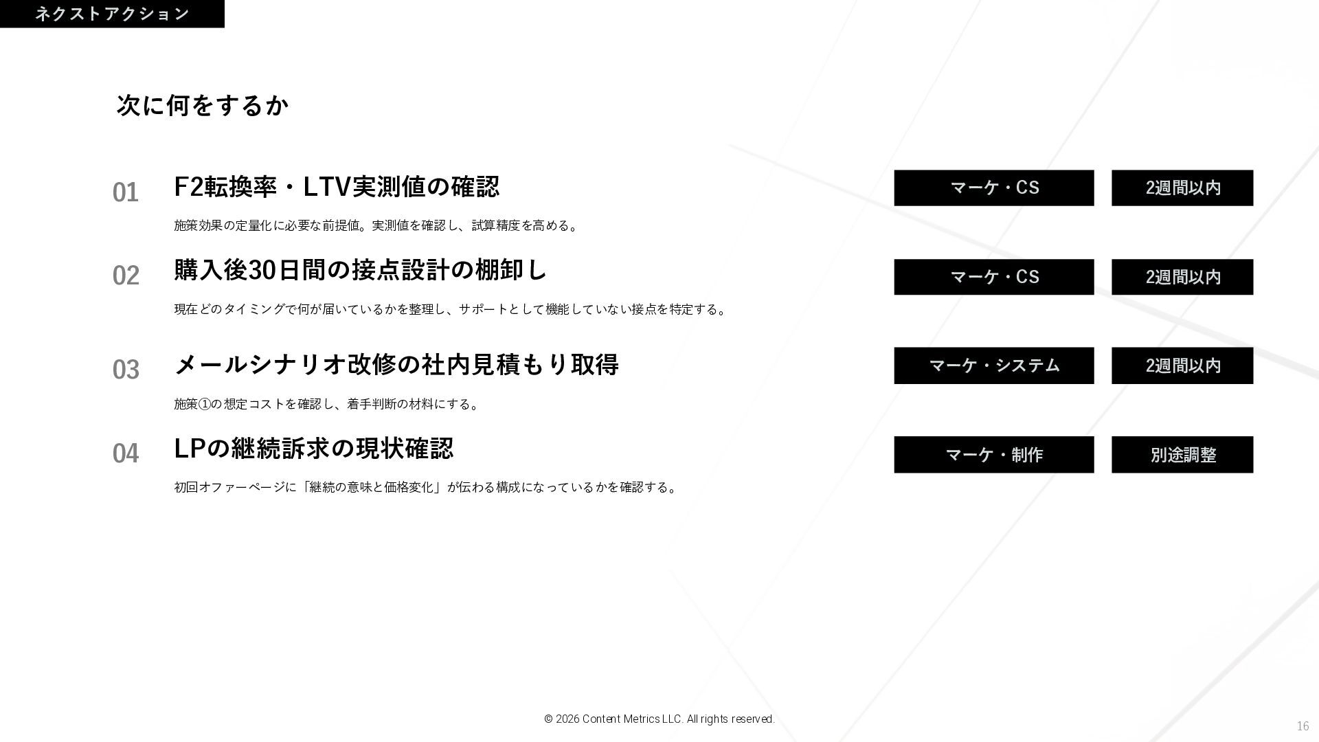 LLC. All rights reserved. 次に何をするか マーケ・CS 2週間以内 マーケ・CS 2週間以内 メールシナリオ改修の社内見積もり取得 施策①の想定コストを確認し、着手判断の材料にする。 LPの継続訴求の現状確認 初回オファーページに「継続の意味と価格変化」が伝わる構成になっているかを確認する。 マーケ・システム 2週間以内 マーケ・制作 別途調整 01 02 03 04