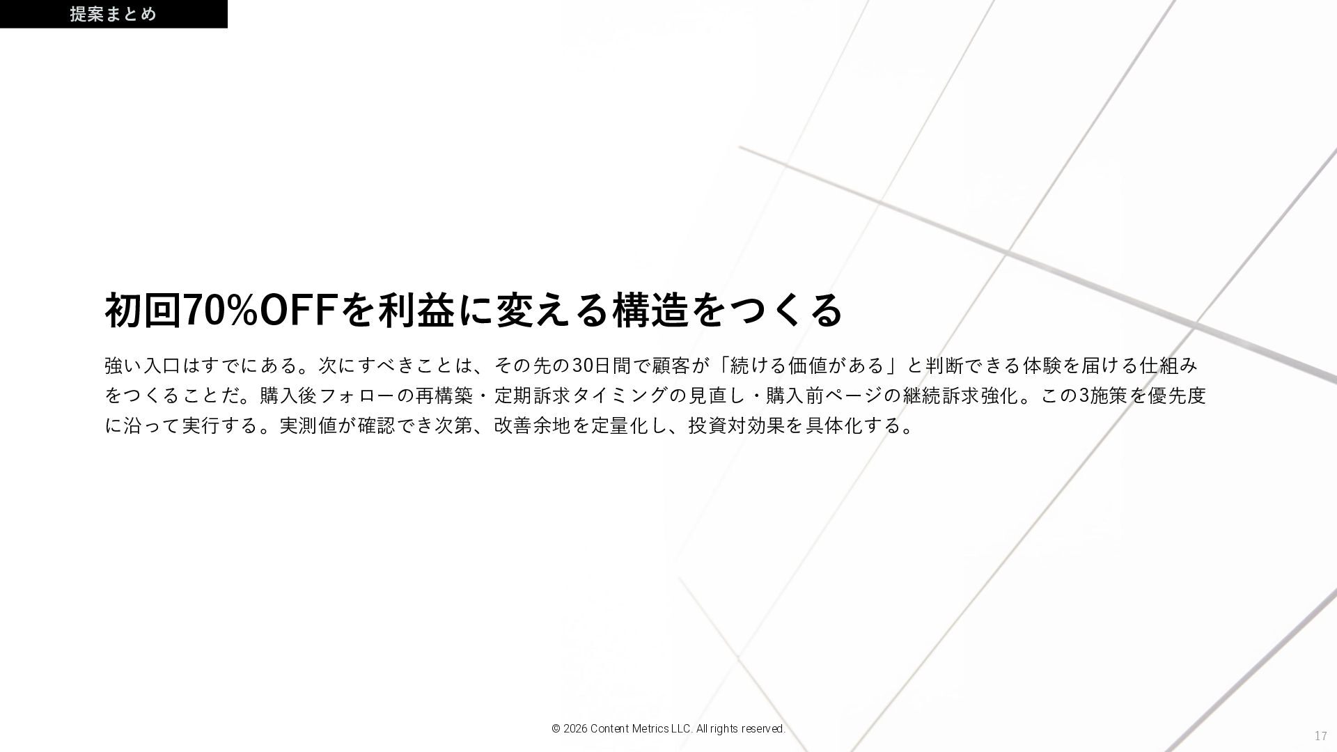 17 初回70%OFFを利益に変える構造をつくる 強い入口はすでにある。次にすべきことは、その先の30日間で顧客が「続ける価値がある」と判断できる体験を届ける仕組み をつくることだ。購入後フォローの再構築・定期訴求タイミングの見直し・購入前ページの継続訴求強化。この3施策を優先度 に沿って実行する。実測値が確認でき次第、改善余地を定量化し、投資対効果を具体化する。 提案まとめ © 2026 Content Metrics