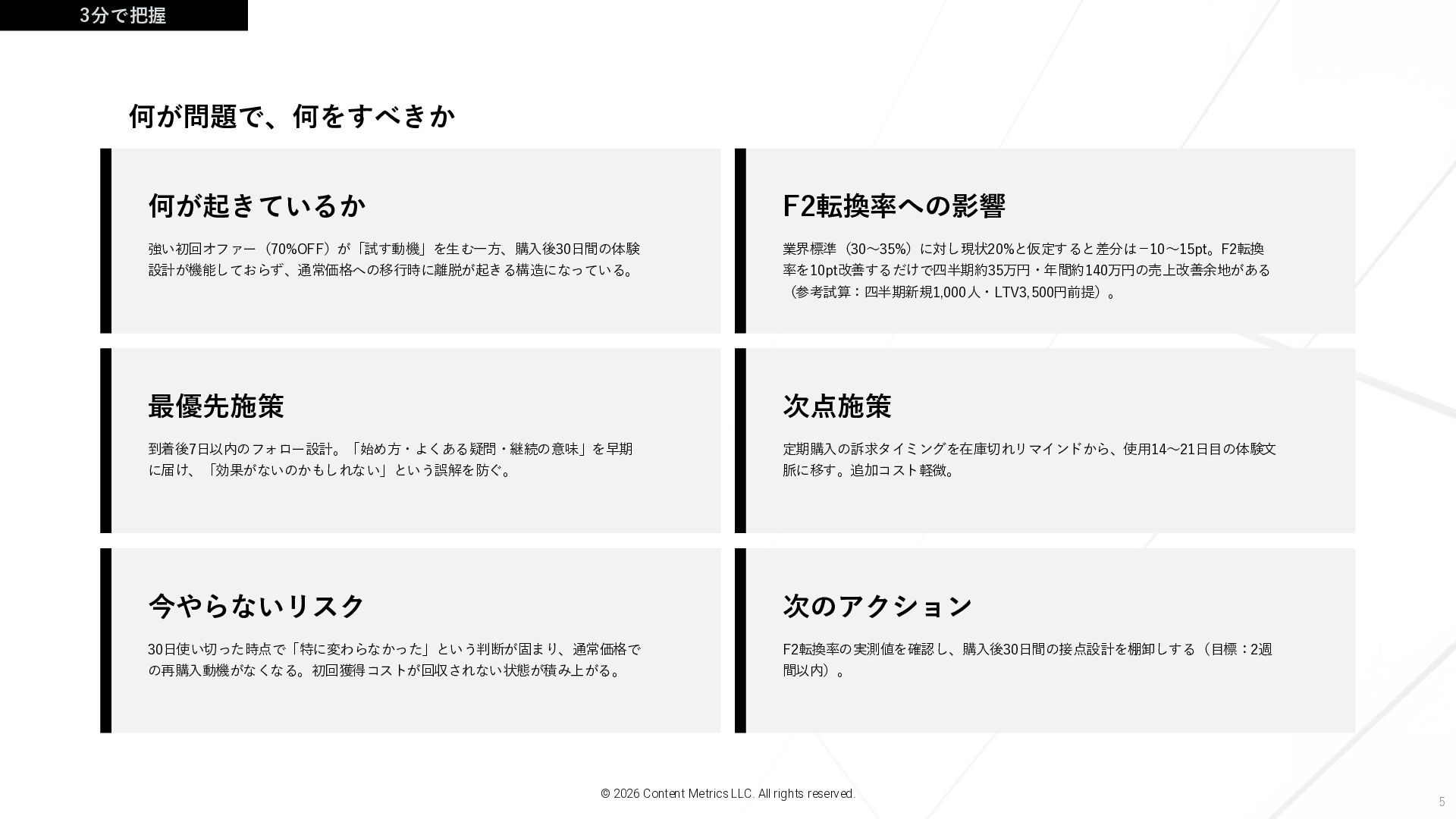 に届け、「効果がないのかもしれない」という誤解を防ぐ。 次点施策 定期購入の訴求タイミングを在庫切れリマインドから、使用14〜21日目の体験文 脈に移す。追加コスト軽微。 今やらないリスク 30日使い切った時点で「特に変わらなかった」という判断が固まり、通常価格で の再購入動機がなくなる。初回獲得コストが回収されない状態が積み上がる。 次のアクション F2転換率の実測値を確認し、購入後30日間の接点設計を棚卸しする(目標:2週 間以内)。 3分で把握 何が問題で、何をすべきか © 2026 Content Metrics LLC. All rights reserved.