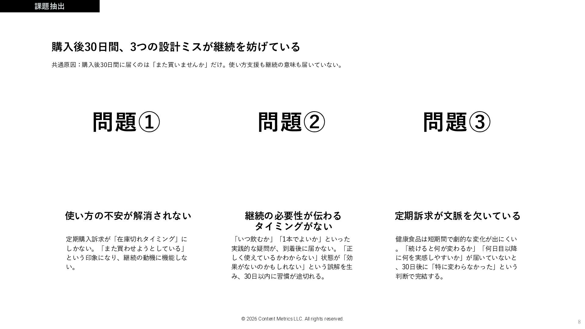 購入後30日間、3つの設計ミスが継続を妨げている 課題抽出 「いつ飲むか」「1本でよいか」といった 実践的な疑問が、到着後に届かない。「正 しく使えているかわからない」状態が「効 果がないのかもしれない」という誤解を生 み、30日以内に習慣が途切れる。 健康食品は短期間で劇的な変化が出にくい 。「続けると何が変わるか」「何日目以降 に何を実感しやすいか」が届いていないと 、30日後に「特に変わらなかった」という 判断で完結する。 © 2026 Content Metrics LLC. All rights reserved. 問題① 問題② 問題③