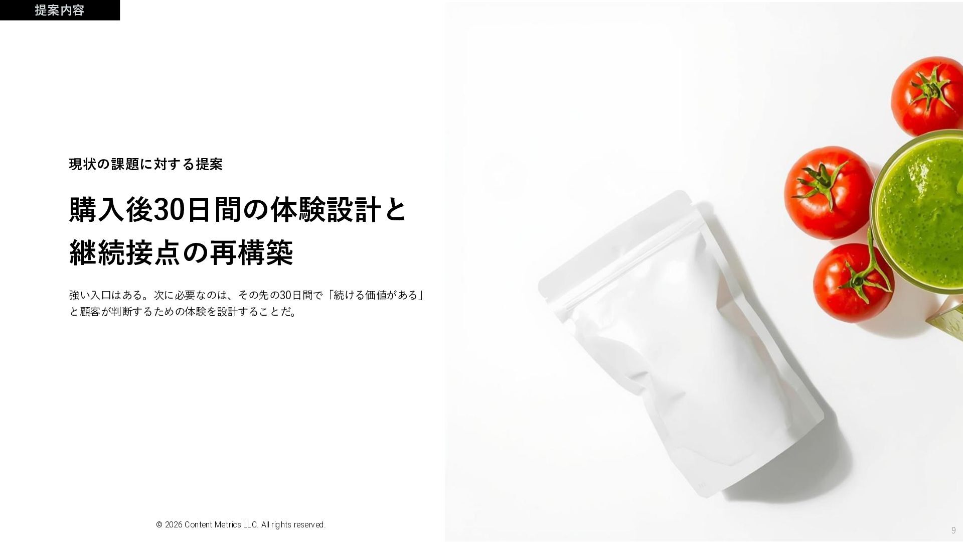 現状の課題に対する提案 9 提案内容 購入後30日間の体験設計と 継続接点の再構築 © 2026 Content Metrics LLC.