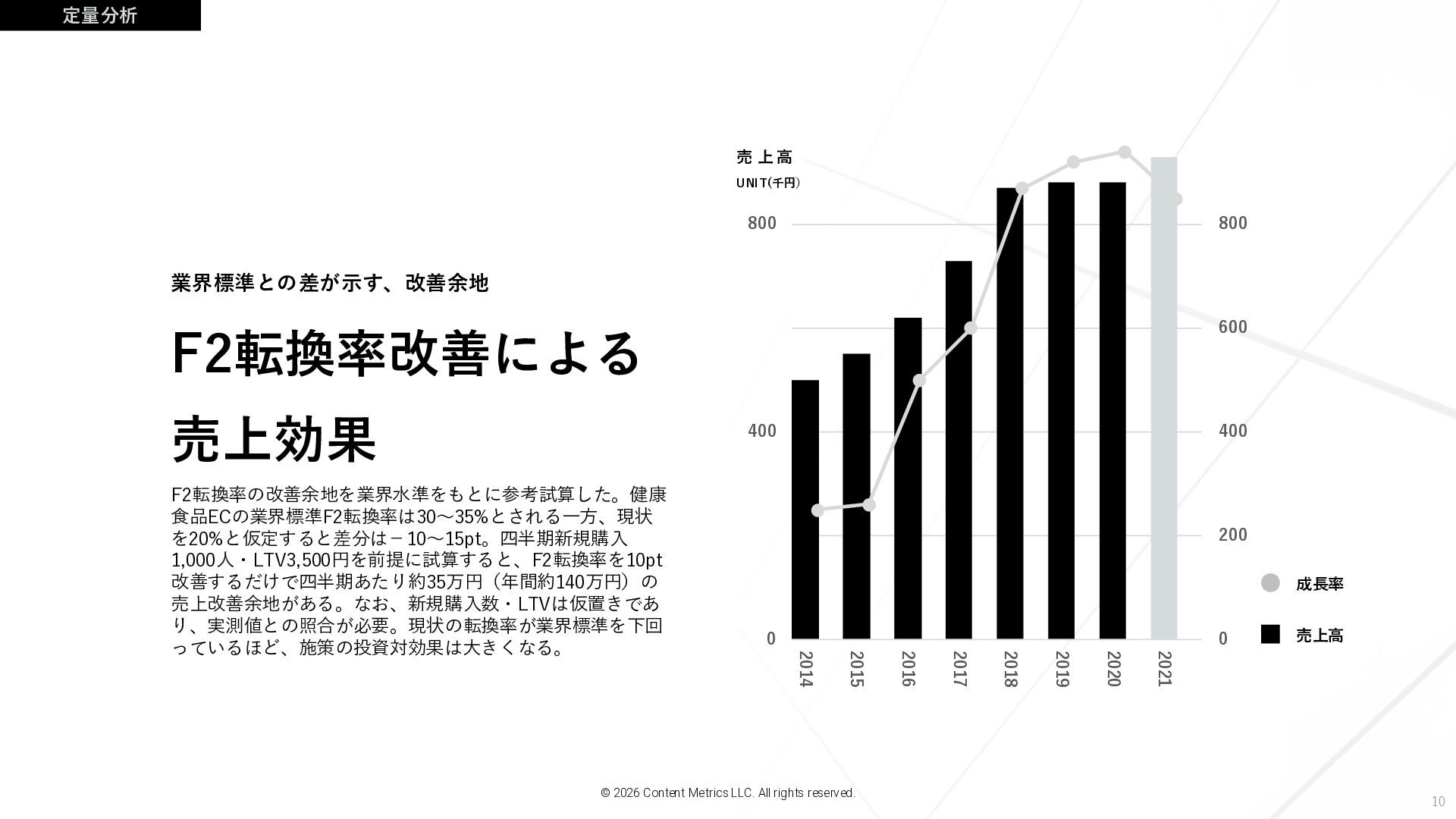 600 800 2014 2015 2016 2017 2018 2019 2020 2021 UNIT(千円) 売 上 高 F2転換率改善による 売上効果 業界標準との差が示す、改善余地 © 2026 Content Metrics LLC. All rights reserved. F2転換率の改善余地を業界水準をもとに参考試算した。健康 食品ECの業界標準F2転換率は30〜35%とされる一方、現状 を20%と仮定すると差分は−10〜15pt。四半期新規購入 1,000人・LTV3,500円を前提に試算すると、F2転換率を10pt 改善するだけで四半期あたり約35万円(年間約140万円)の 売上改善余地がある。なお、新規購入数・LTVは仮置きであ り、実測値との照合が必要。現状の転換率が業界標準を下回 っているほど、施策の投資対効果は大きくなる。
