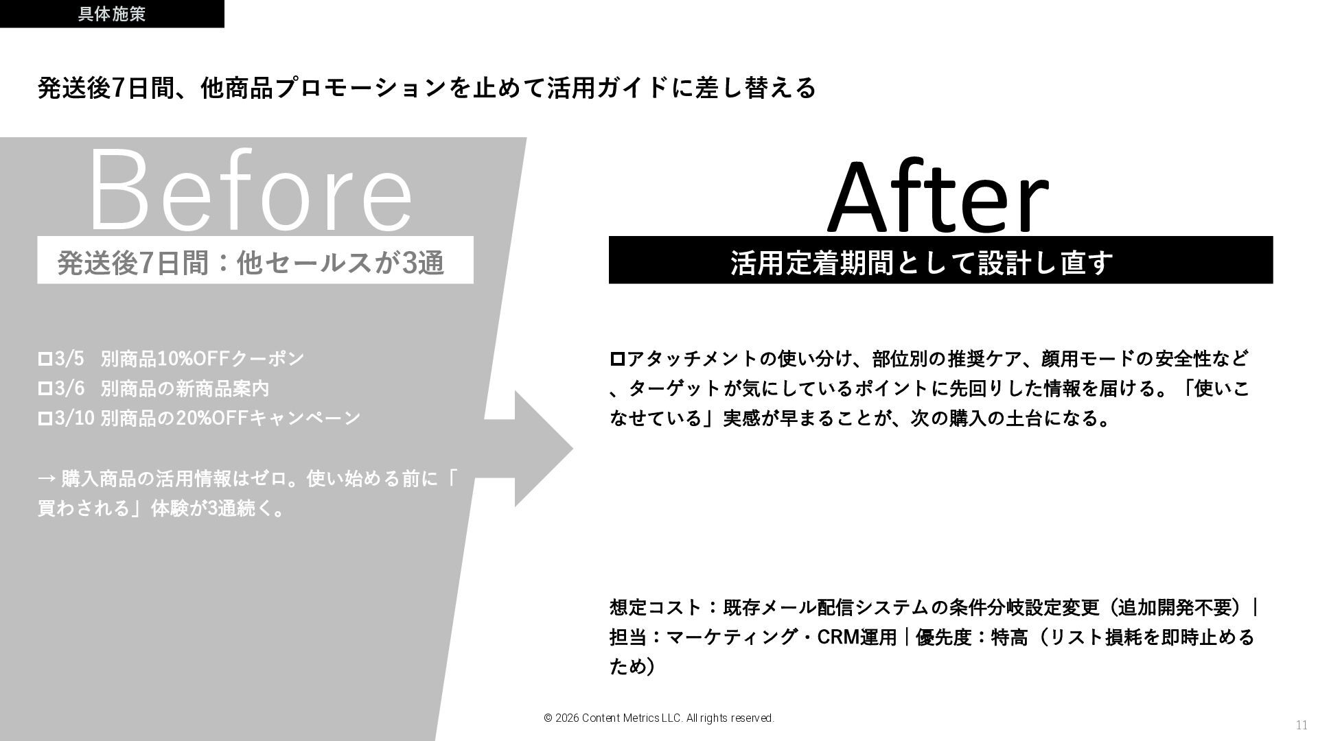 購入商品の活用情報はゼロ。使い始める前に「 買わされる」体験が3通続く。 具体施策 © 2026 Content Metrics LLC. All rights reserved. 活用定着期間として設計し直す アタッチメントの使い分け、部位別の推奨ケア、顔用モードの安全性など ターゲットが気にしているポイントに先回りした情報を届ける。 →「使いこなせている」実感が早まることが、次の購入の土台になる。 発送後7日間:他セールスが3通 発送後7日間、他商品プロモーションを止めて活用ガイドに差し替える 想定コスト:既存メール配信システムの条件分岐設定変更(追加開発不要)| 担当:マーケティング・CRM運用 | 優先度:特高(リスト損耗を即時止める ため)