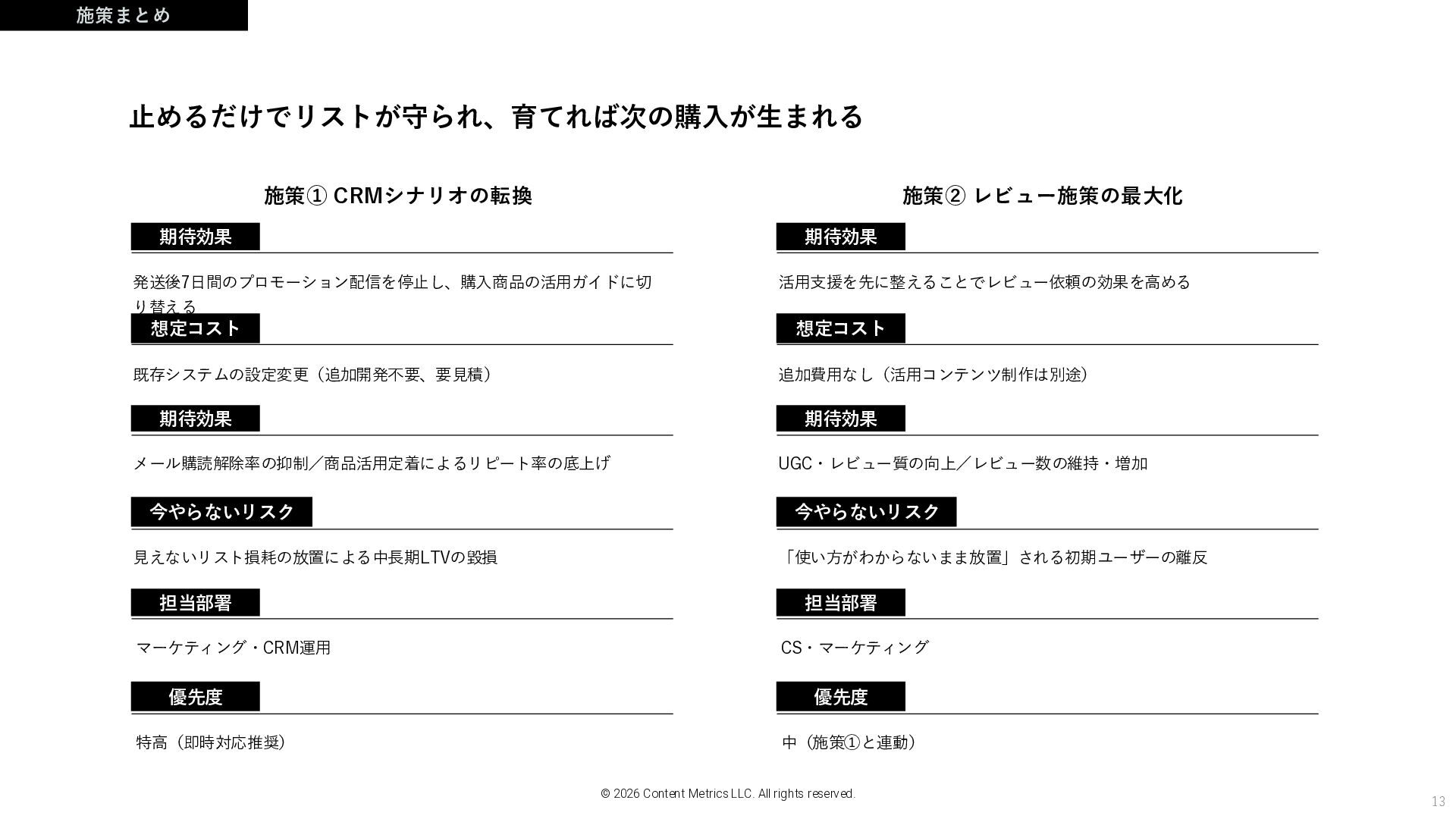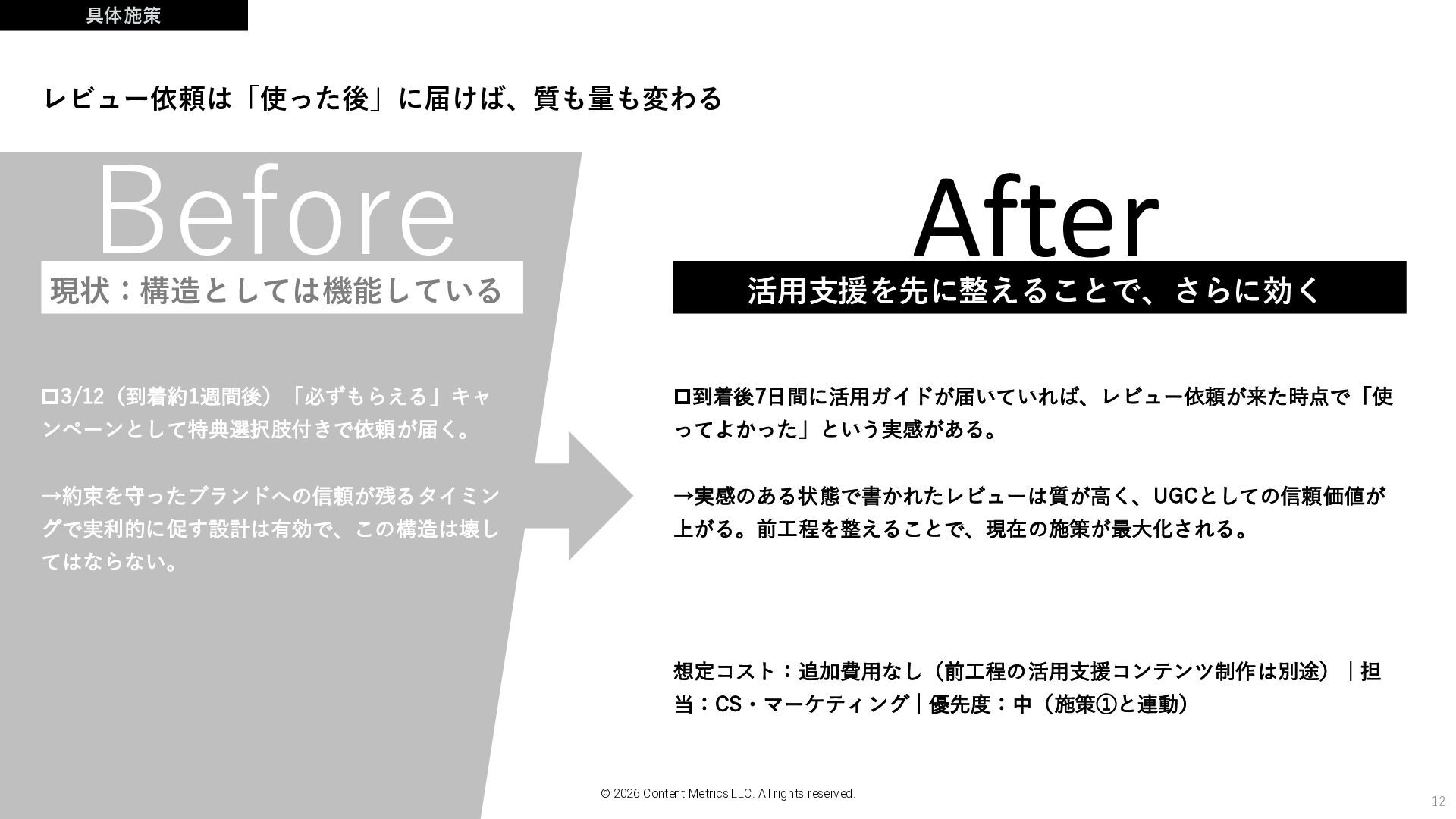 2026 Content Metrics LLC. All rights reserved. 活用支援を先に整えることで、さらに効く 到着後7日間に活用ガイドが届いていれば、レビュー依頼が来た時点で「使 ってよかった」という実感がある。 →実感のある状態で書かれたレビューは質が高く、UGCとしての信頼価値が 上がる。前工程を整えることで、現在の施策が最大化される。 現状:構造としては機能している レビュー依頼は「使った後」に届けば、質も量も変わる 想定コスト:追加費用なし(前工程の活用支援コンテンツ制作は別途) | 担 当:CS・マーケティング | 優先度:中(施策①と連動)