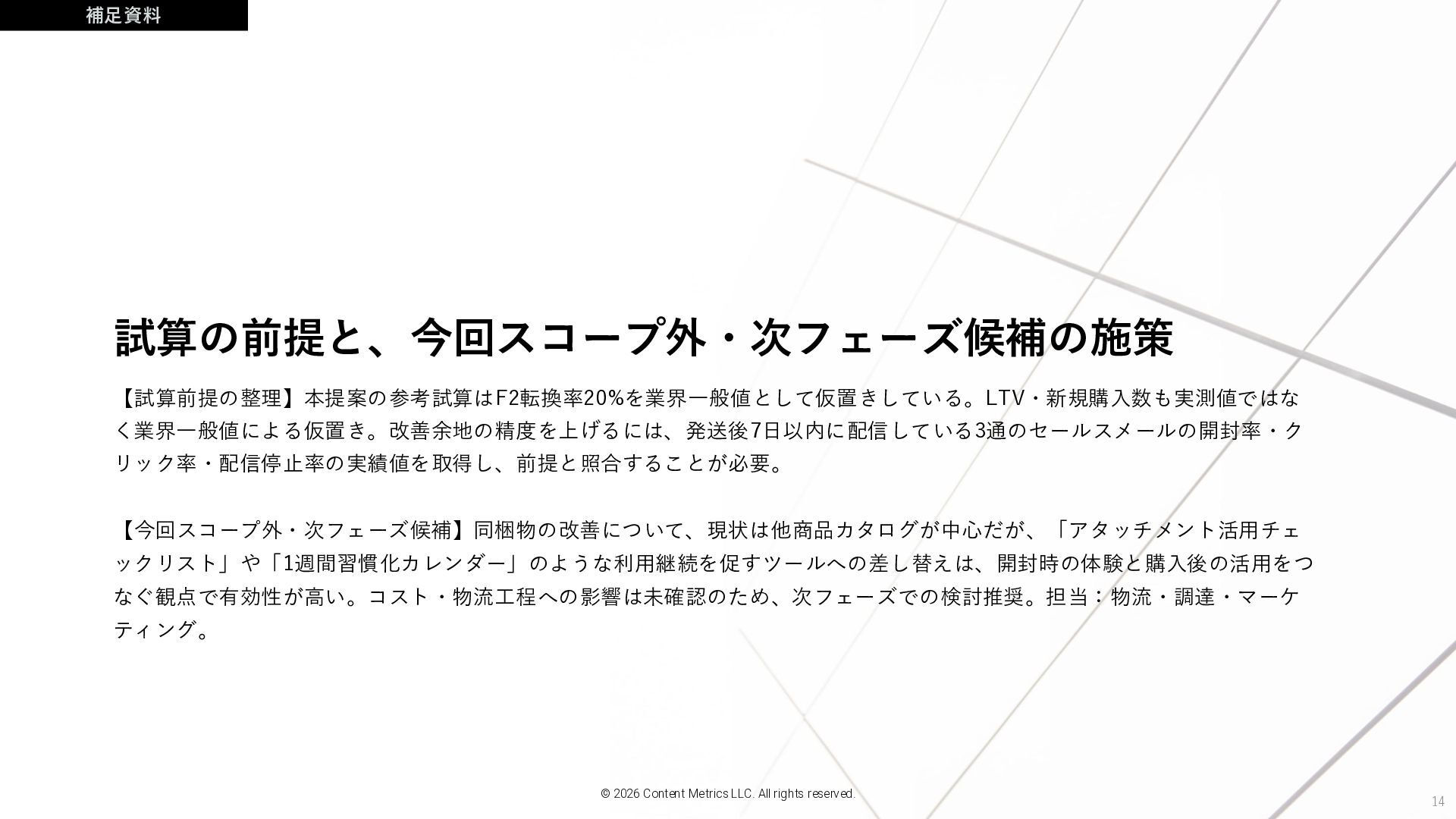 期待効果 想定コスト 13 施策まとめ © 2026 Content Metrics LLC. All rights reserved. 止めるだけでリストが守られ、育てれば次の購入が生まれる 施策① CRMシナリオの転換 発送後7日間のプロモーション配信を停止し、購入商品の活用ガイドに切 り替える 既存システムの設定変更(追加開発不要、要見積) メール購読解除率の抑制/商品活用定着によるリピート率の底上げ 見えないリスト損耗の放置による中長期LTVの毀損 マーケティング・CRM運用 特高(即時対応推奨) 施策② レビュー施策の最大化 活用支援を先に整えることでレビュー依頼の効果を高める 追加費用なし(活用コンテンツ制作は別途) UGC・レビュー質の向上/レビュー数の維持・増加 「使い方がわからないまま放置」される初期ユーザーの離反 CS・マーケティング 中(施策①と連動)