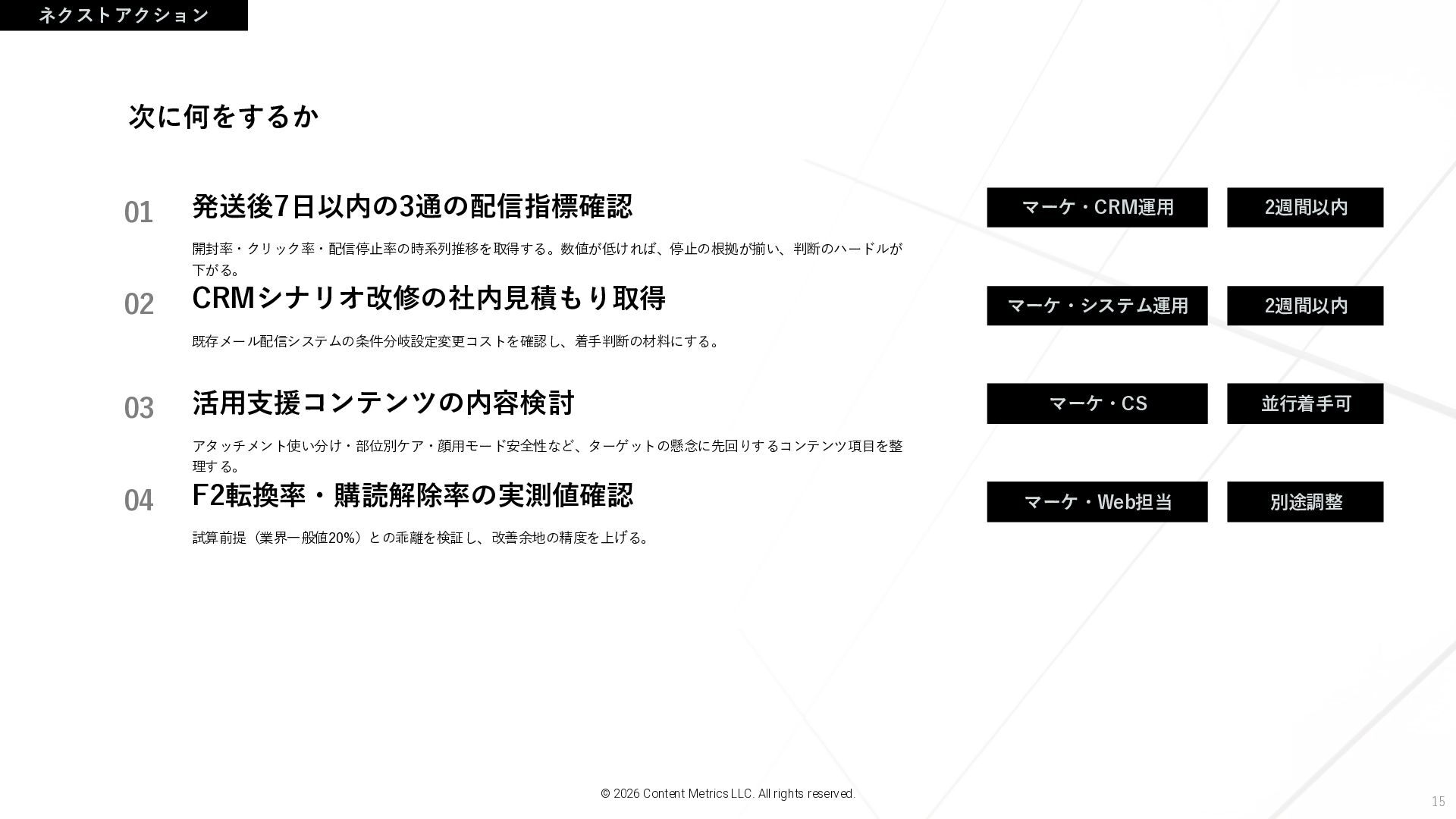 15 発送後7日以内の3通の配信指標確認 開封率・クリック率・配信停止率の時系列推移を取得する。数値が低ければ、停止の根拠が揃い、判断のハードルが 下がる。 CRMシナリオ改修の社内見積もり取得 既存メール配信システムの条件分岐設定変更コストを確認し、着手判断の材料にする。 ネクストアクション © 2026 Content