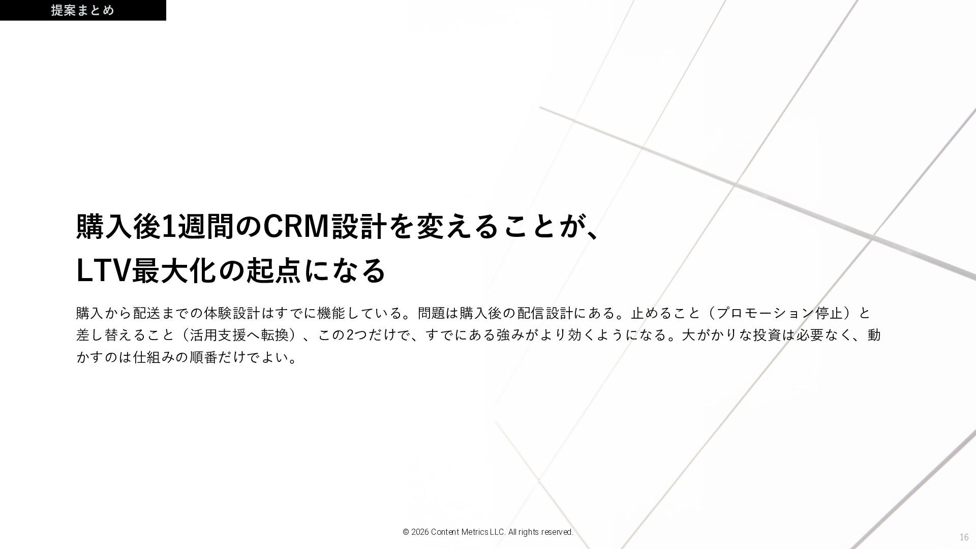 16 購入後1週間のCRM設計を変えることが、 LTV最大化の起点になる 購入から配送までの体験設計はすでに機能している。問題は購入後の配信設計にある。止めること(プロモーション停止)と 差し替えること(活用支援へ転換)、この2つだけで、すでにある強みがより効くようになる。大がかりな投資は必要なく、動 かすのは仕組みの順番だけでよい。 提案まとめ © 2026 Content