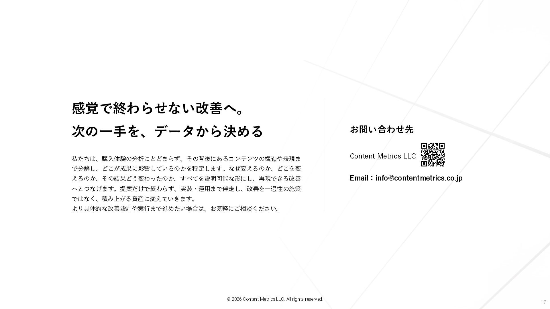 17 私たちは、購入体験の分析にとどまらず、その背後にあるコンテンツの構造や表現ま で分解し、どこが成果に影響しているのかを特定します。なぜ変えるのか、どこを変 えるのか、その結果どう変わったのか。すべてを説明可能な形にし、再現できる改善 へとつなげます。提案だけで終わらず、実装・運用まで伴走し、改善を一過性の施策 ではなく、積み上がる資産に変えていきます。 より具体的な改善設計や実行まで進めたい場合は、お気軽にご相談ください。 感覚で終わらせない改善へ。 次の一手を、データから決める お問い合わせ先