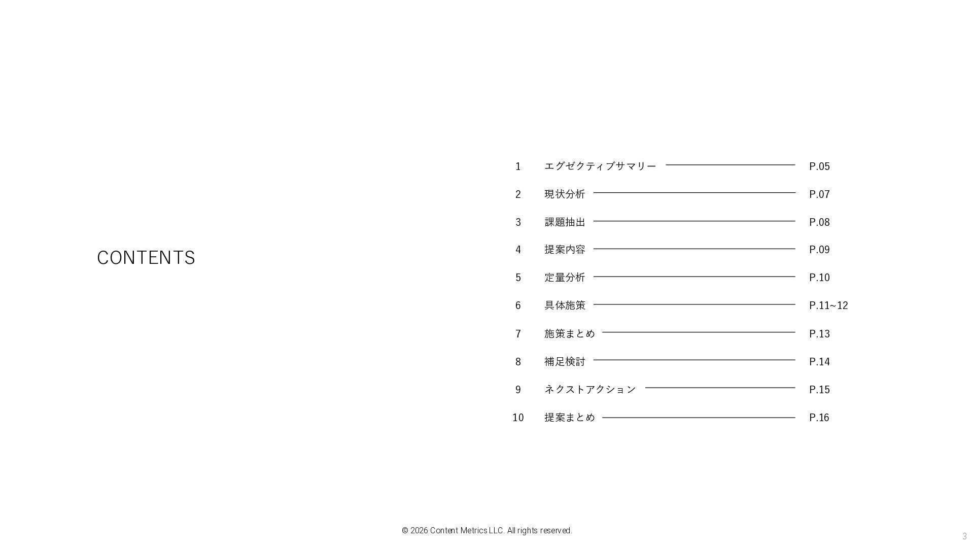 P.15 P.16 エグゼクティブサマリー 現状分析 課題抽出 提案内容 定量分析 具体施策 施策まとめ 補足検討 ネクストアクション 提案まとめ 1 2 3 4 5 6 7 8 9 10 © 2026 Content Metrics LLC. All rights reserved.