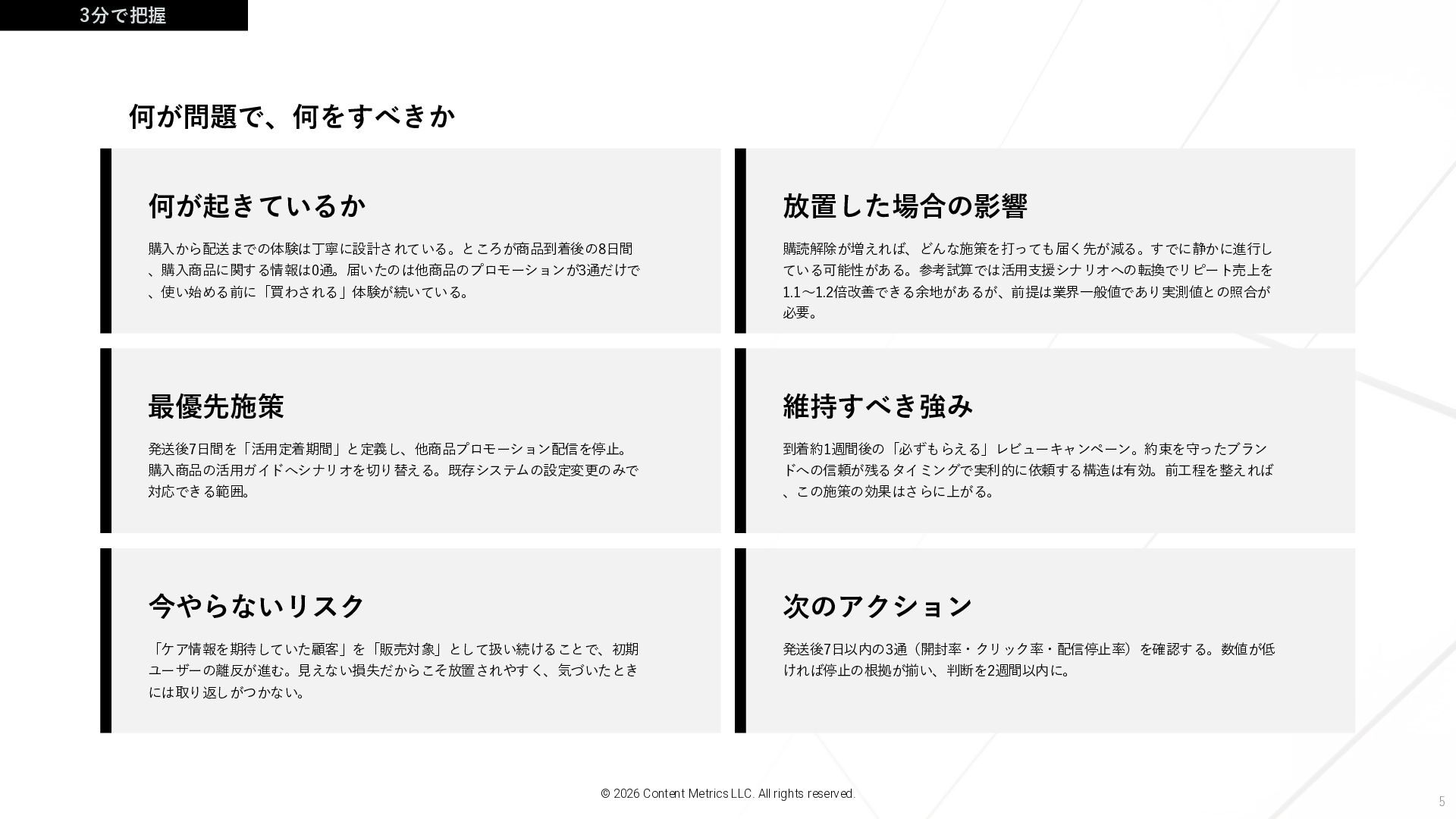 最優先施策 発送後7日間を「活用定着期間」と定義し、他商品プロモーション配信を停止。 購入商品の活用ガイドへシナリオを切り替える。既存システムの設定変更のみで 対応できる範囲。 維持すべき強み 到着約1週間後の「必ずもらえる」レビューキャンペーン。約束を守ったブラン ドへの信頼が残るタイミングで実利的に依頼する構造は有効。前工程を整えれば 、この施策の効果はさらに上がる。 今やらないリスク 「ケア情報を期待していた顧客」を「販売対象」として扱い続けることで、初期 ユーザーの離反が進む。見えない損失だからこそ放置されやすく、気づいたとき には取り返しがつかない。 次のアクション 発送後7日以内の3通(開封率・クリック率・配信停止率)を確認する。数値が低 ければ停止の根拠が揃い、判断を2週間以内に。 3分で把握 何が問題で、何をすべきか © 2026 Content Metrics LLC. All rights reserved.