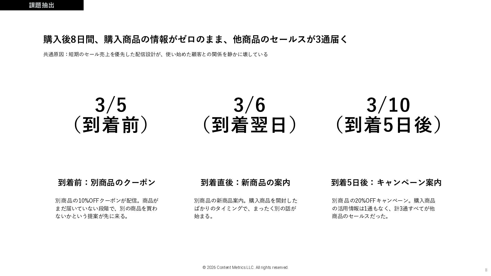 別商品の新商品案内。購入商品を開封した ばかりのタイミングで、まったく別の話が 始まる。 別商品の20%OFFキャンペーン。購入商品 の活用情報は1通もなく、計3通すべてが他 商品のセールスだった。 © 2026 Content Metrics LLC. All rights reserved. 3/5 (到着前) 3/6 (到着翌日) 3/10 (到着5日後)