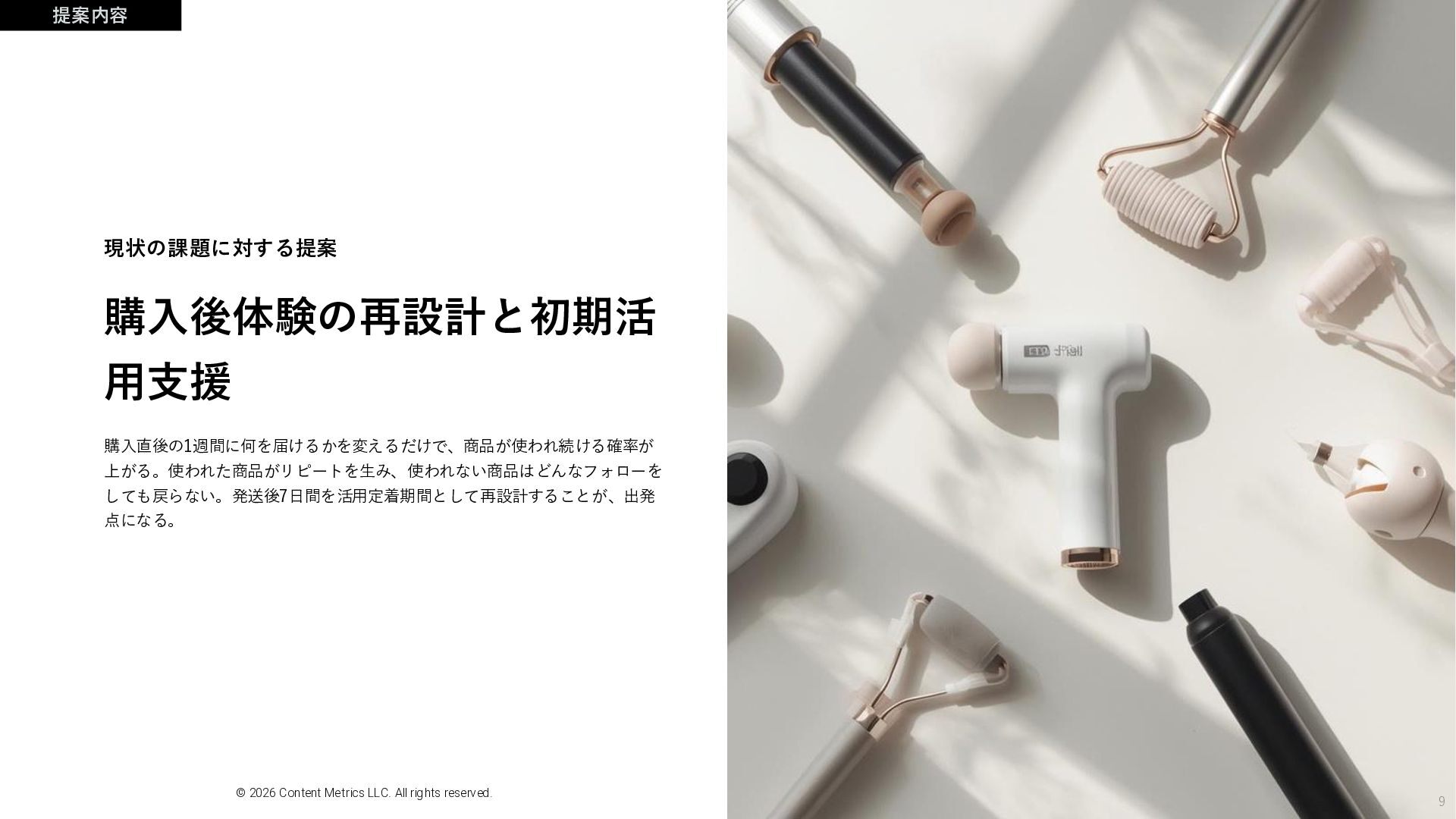 現状の課題に対する提案 9 提案内容 購入後体験の再設計と初期活 用支援 © 2026 Content Metrics LLC.