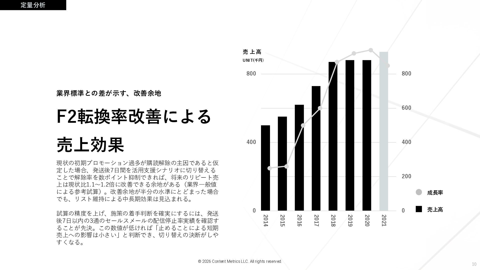 600 800 2014 2015 2016 2017 2018 2019 2020 2021 UNIT(千円) 売 上 高 F2転換率改善による 売上効果 業界標準との差が示す、改善余地 © 2026 Content Metrics LLC. All rights reserved. 現状の初期プロモーション過多が購読解除の主因であると仮 定した場合、発送後7日間を活用支援シナリオに切り替える ことで解除率を数ポイント抑制できれば、将来のリピート売 上は現状比1.1〜1.2倍に改善できる余地がある(業界一般値 による参考試算)。改善余地が半分の水準にとどまった場合 でも、リスト維持による中長期効果は見込まれる。 試算の精度を上げ、施策の着手判断を確実にするには、発送 後7日以内の3通のセールスメールの配信停止率実績を確認す ることが先決。この数値が低ければ「止めることによる短期 売上への影響は小さい」と判断でき、切り替えの決断がしや すくなる。