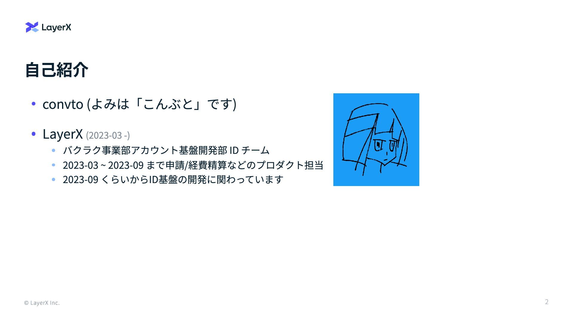 自己紹介 © LayerX Inc. convto (よみは「こんぶと」です) LayerX (2023-03 -) バクラク事業部アカウント基盤開発部