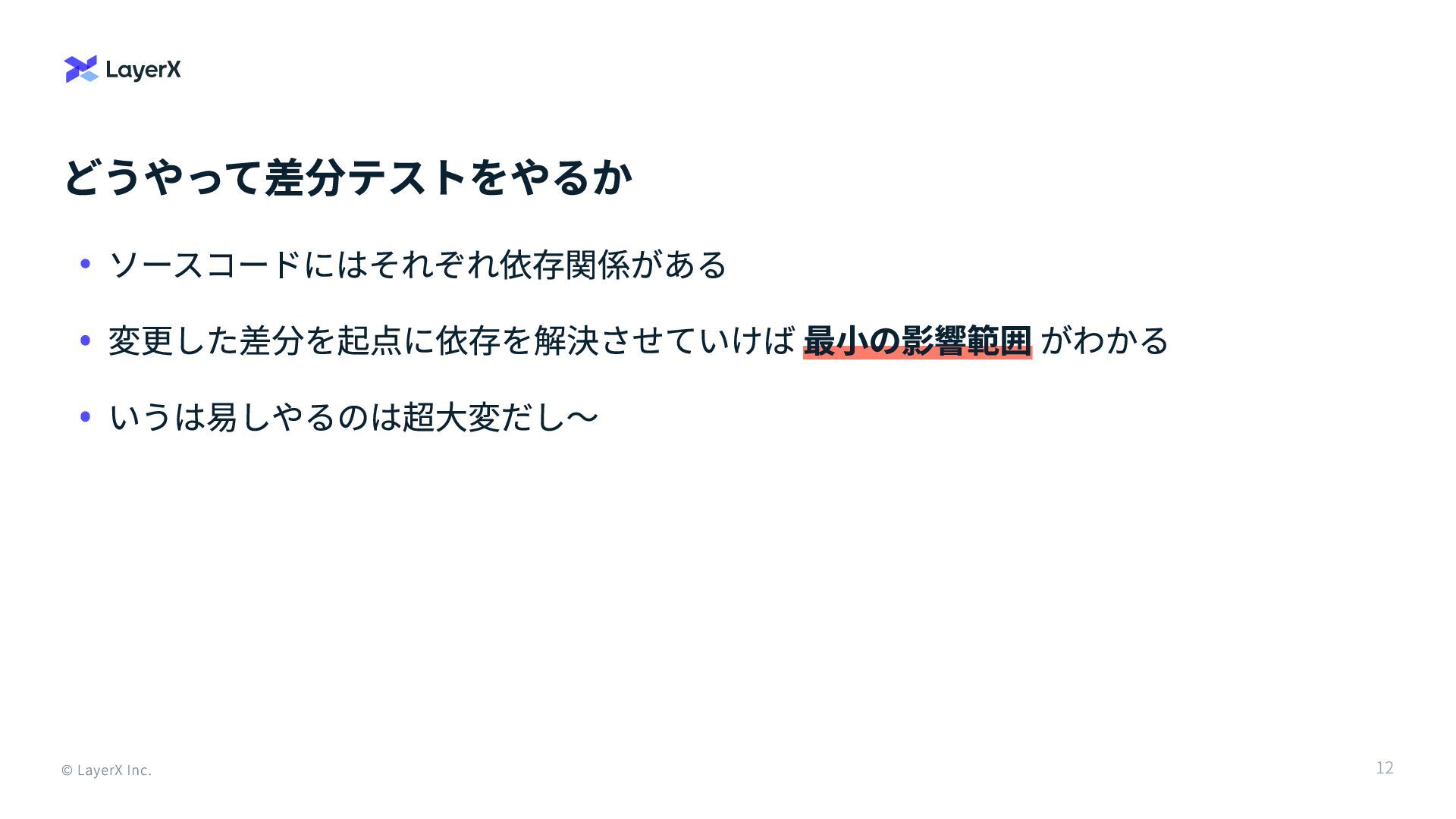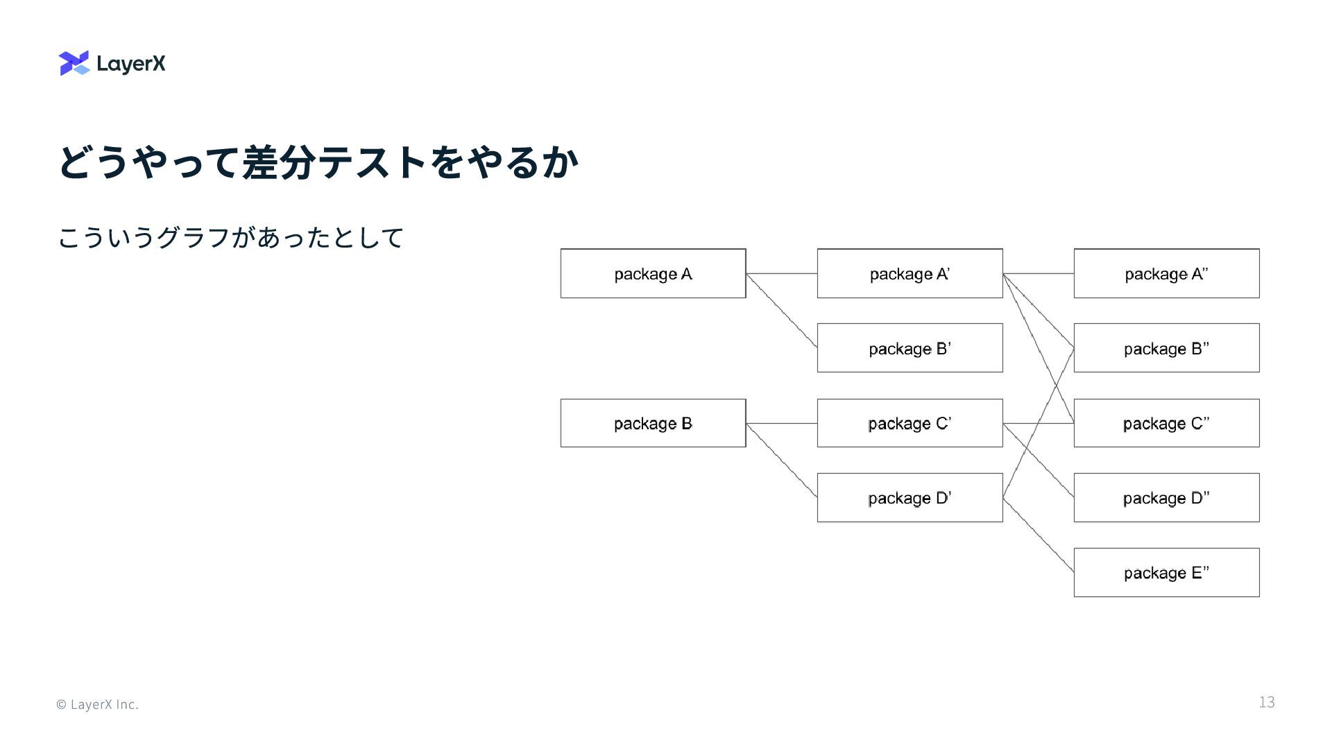 どうやって差分テストをやるか © LayerX Inc. ソースコードにはそれぞれ依存関係がある 変更した差分を起点に依存を解決させていけば 最小の影響範囲 がわかる いうは易しやるのは超大変だし〜 12