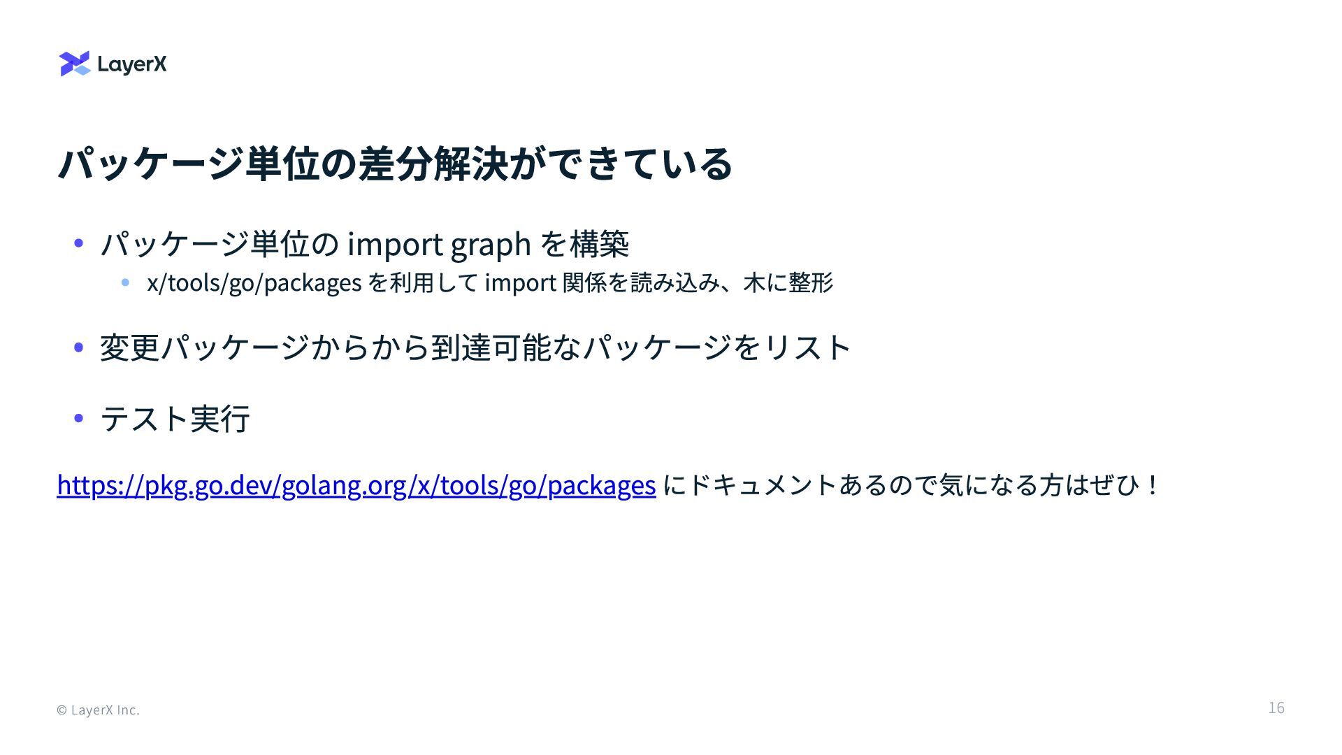 パッケージ単位の差分解決ができている https://pkg.go.dev/golang.org/x/tools/go/packages にドキュメントあるので気になる方はぜひ! © LayerX Inc. パッケージ単位の import graph を構築