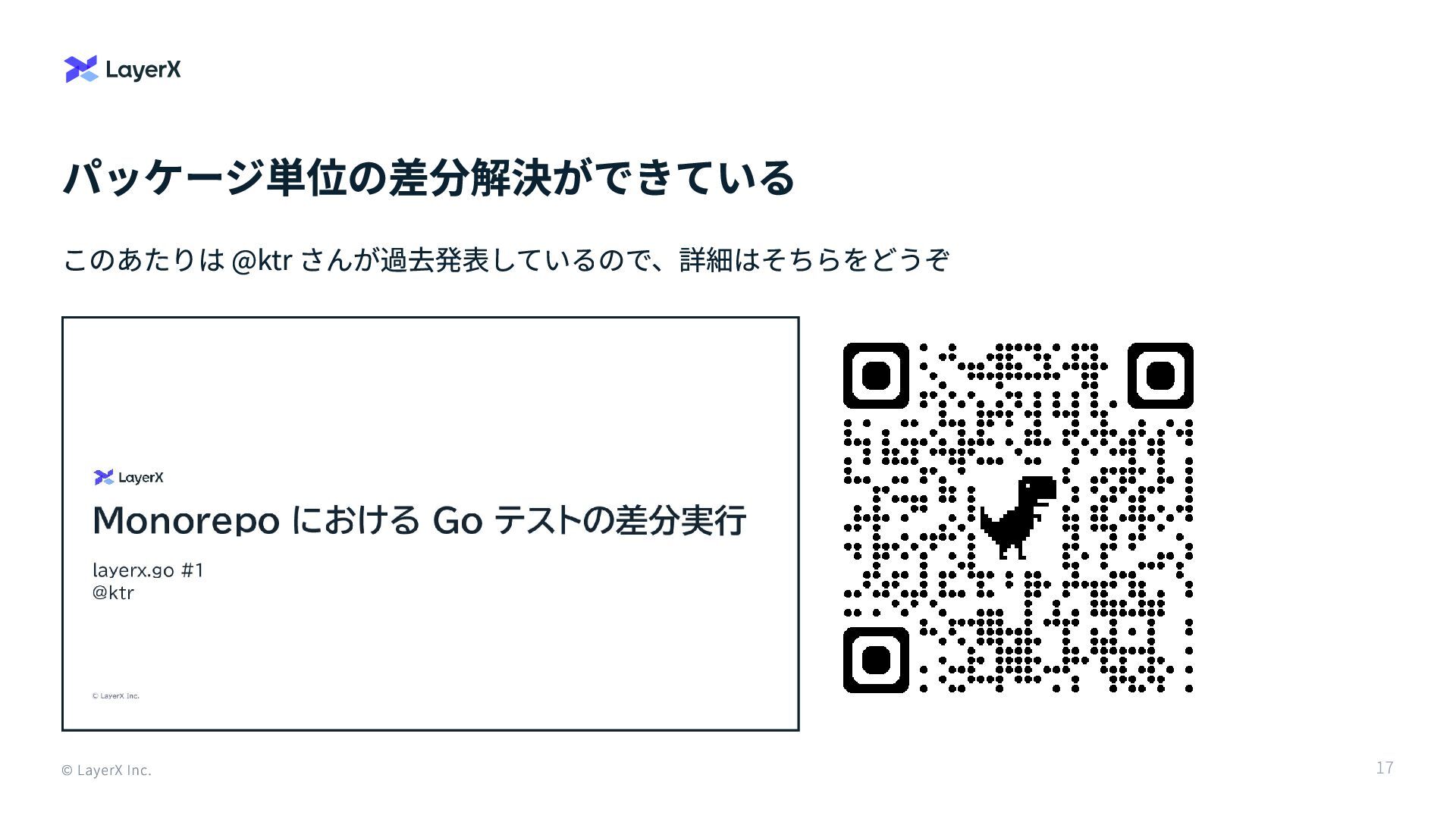パッケージ単位の差分解決ができている このあたりは @ktr さんが過去発表しているので、詳細はそちらをどうぞ © LayerX Inc. 17