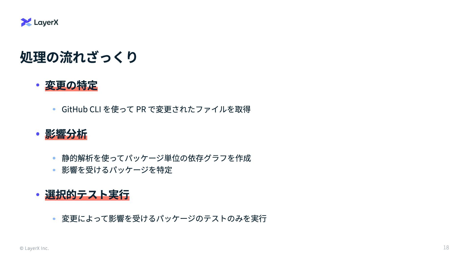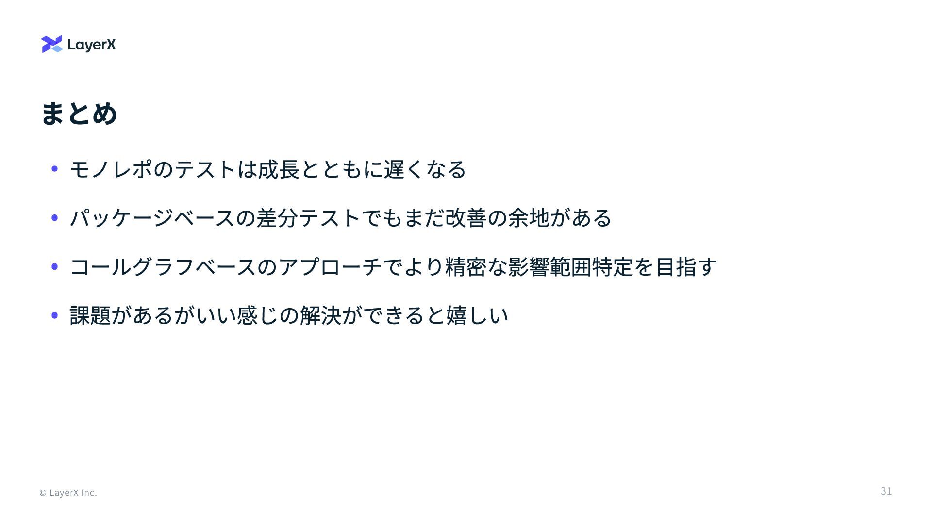まとめ © LayerX Inc. モノレポのテストは成長とともに遅くなる パッケージベースの差分テストでもまだ改善の余地がある コールグラフベースのアプローチでより精密な影響範囲特定を目指す 課題があるがいい感じの解決ができると嬉しい 31