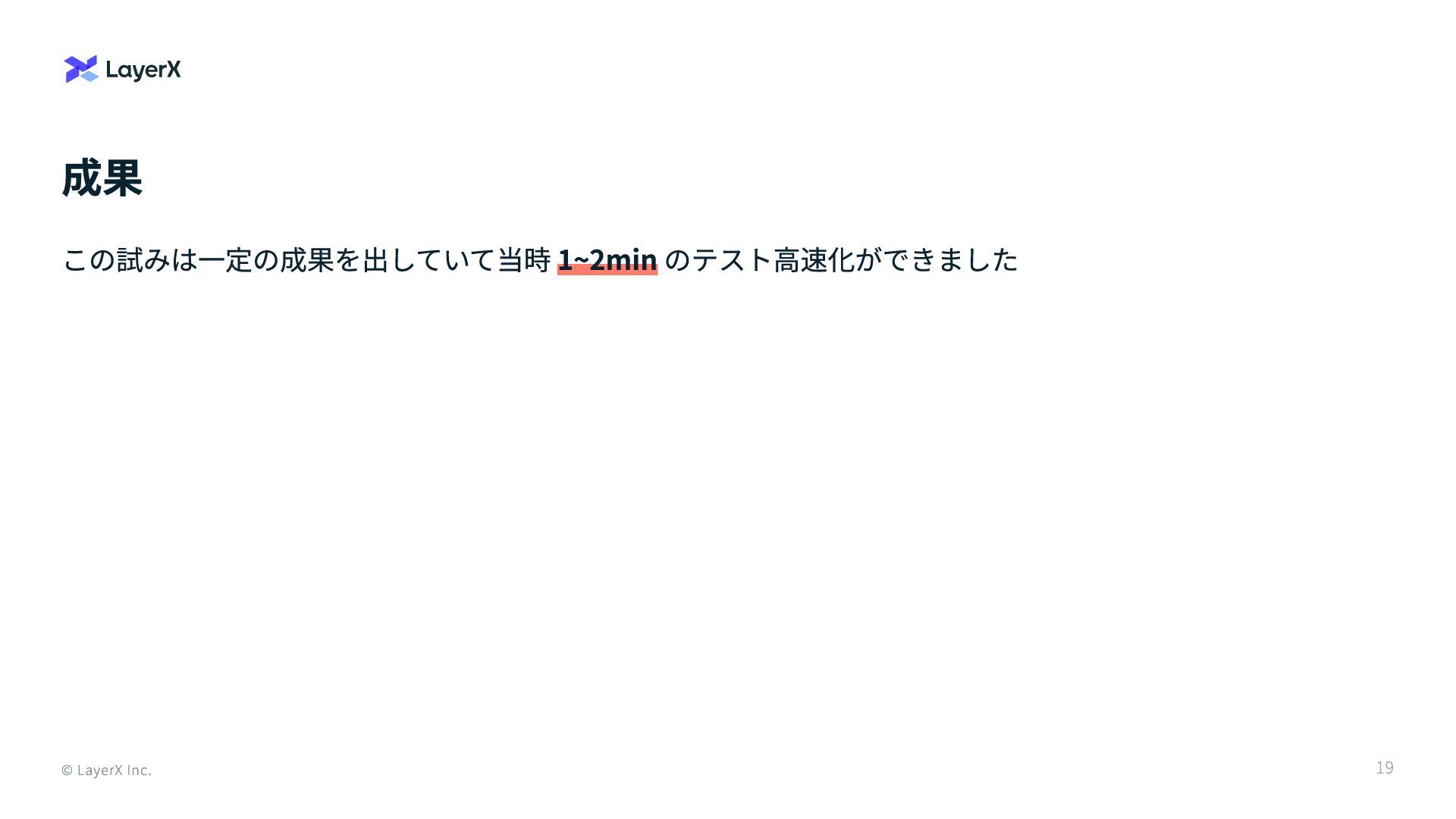 成果 この試みは一定の成果を出していて当時 1~2min のテスト高速化ができました © LayerX Inc. 19